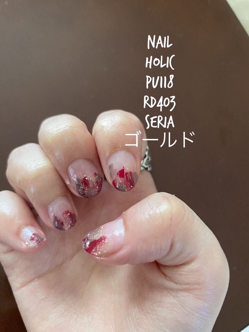 ❁*·⑅セルフネイル❁⃘*.゚🧚♂️塗りかけネイル?!・LIPSの投稿を参考して塗りかけネイルに挑戦してみました!・色のバランスが難しい💦・シルバー・ゴールドを入れるといい感じ(^-^)#ネイルホリック#PU106#PU118#RD403#GENEネイル#ゴールド#シルバー#セリアSHジェルネイル