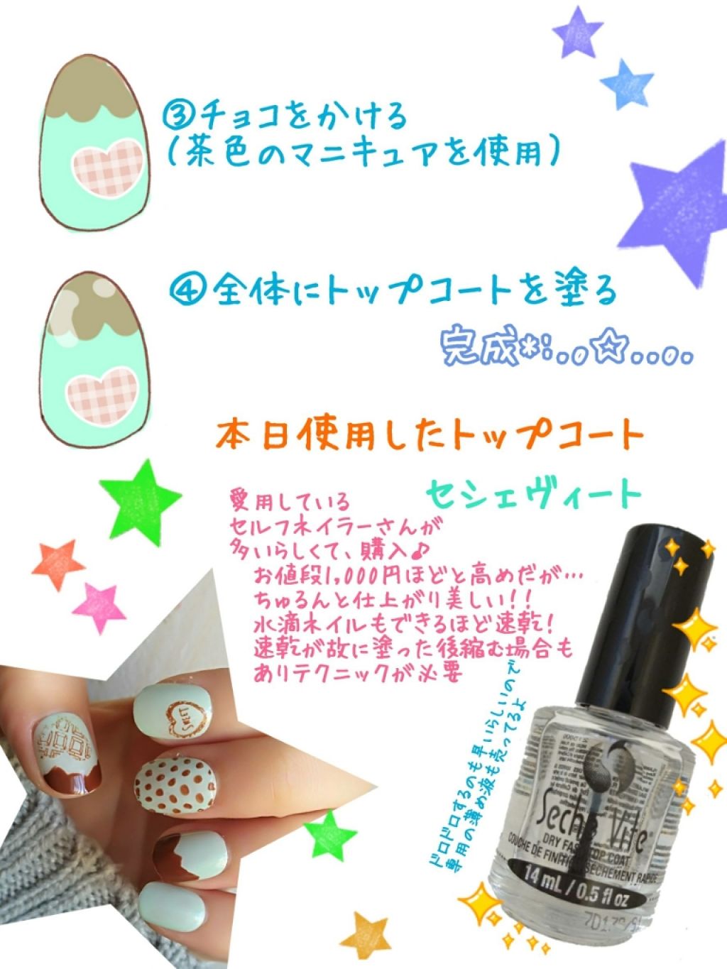 💘バレンタインネイル💘 👉やり方は写真を大きくしてスライドしてくださいね🍫 引き続きバレンタインネイルさくさくいきます~💨💨チョコミントネイル🍫本日はマニキュアとトップコートを紹介💕まずはマニキュア💅💚デュカートナチュラルネイルカラーNミントカーディガン 600円💚まさにミントネイルをするために生まれてきたようなカラー😄イメージ通りのミント色🌱春~夏にかけてもにも使えそうなカラーですね!デュカートのマニキュアはブラシが大きめで塗りやすくムラになりにくいのが特徴ですね😉そしてオススメのトップコート💙セシェヴィートのトップコート💙トップコートのオススメで検索するとよく見かけるので購入してみました😄ネットで購入して1,000円ほどとお高めですがその優秀な機能性&仕上がり✨💙速乾にすぐれており その性質を活かして水滴ネイルに使えるほど!💙まるでジェルネイルのようなツヤ✨ 普段のネイルが数段レベルアップします!残念な点をあげるなら💔乾くのが早い分、下のマニキュアを重ねすぎると 縮むことがある💦💔粘度が高くドロドロになるのが早い 専用の薄め液もあります。ちょっと塗るのが難しいみたいですね💦*:..。o○ ○o。..:**:..。o○ ○o。..:*さて、今回のチョコミントの準備物のご紹介💚☑ネイルホリック YE500☑デュカートナチュラルネイルカラーNミントカーディガン☑デュカートナチュラルネイルカラーNブラウニーチョコレート(過去の限定色)☑ゴールドラメの入ったマニキュア☑ネイルスタンプ☑プレート(キャンドゥ・ダイソー2種使用)☑紙☑はさみ☑セシェヴィート トップコート*:..。o○ ○o。..:**:..。o○ ○o。..:*だいたいミントカーディガンを単色塗りして、チョコレートのように茶色のマニキュアをかけておけばOKなんですが、親指がさみしかったのでハート型にスタンプ!チョコレート柄にしたかったんですが、チョコレート柄ハート型ない…🍫なので下記の方法でやってみました👇👇💚親指のネイル💚★下準備紙を用意し、半分に折り曲げスタンプしたいハートの大きさにハサミで切り抜く。①ミントカーディガンを好みに合わせて1~2度塗りする②ネイルスタンプを使い、🔻ネイルスタンプの使い方はこちらから🔻#ぼろたまチョコミントネイルマニキュアをプレートに塗ってスクレイパーで余分な液を切ったあとに上に先ほどの紙を置いて紙の上からスタンパーを転がす切り抜いたハートの部分だけに液がついてくると思うのでそれをスタンプする★ハートの周りをゴールドラメのマニキュアで囲っても可愛い💕写真のものは囲っています。③茶色のマニキュアをチョコのように塗る④トップコートを塗る完成*:.。☆..。.(´∀`人)*:..。o○ ○o。..:**:..。o○ ○o。..:*他にクラフトパンチとかを使っても良さそうですね😉人差し指のハート、中指の水玉模様はダイソーのスタンププレートを使用しています💕水玉もすべて同じ大きさではなく、ちょっといびつなのも可愛いですね😃ミント×チョコのカラーはどう組み合わせても美味しそうになるネイルでした💚*:..。o○ ○o。..:**:..。o○ ○o。..:*#オススメ#百均#マニキュア#ネイル#ネイルデザイン#バレンタイン#バレンタインネイル#チョコネイル#かわいい
