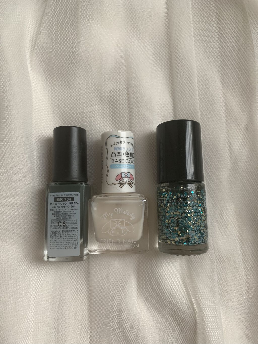 ▲ネイルホリックGR704×COLORCLUB?▲△ネイルホリックGR704△300円+税?まみどりではなく、モスグリーンでかわいいです。上品。まあまあ乾きも早いし、ムラもそこまでできません。色白ではないので、全指に塗ったらどきつかったため二...
