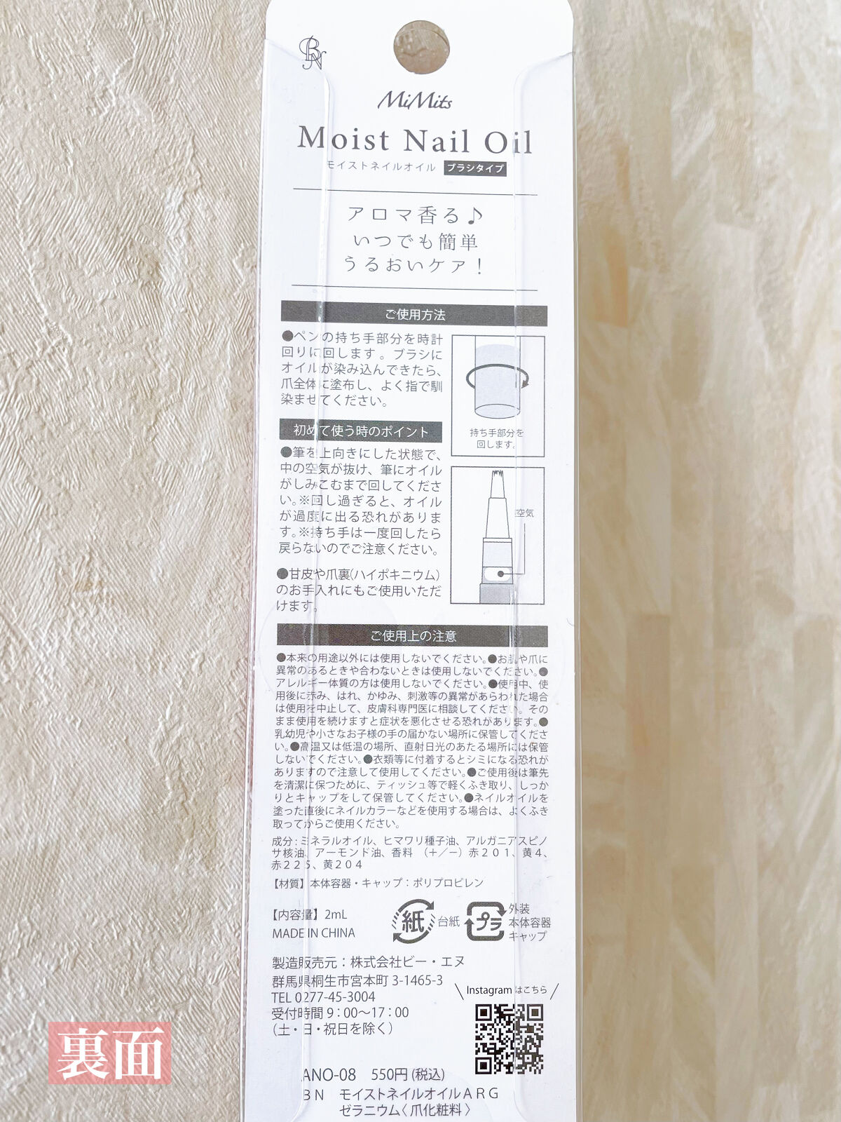 持ち運びやすそうな筆タイプのネイルオイル購入! ビー・エヌMimitsモイストネイルオイルゼラニウムの香りドンキでは550円+香りも全種類あったので好きな香りを選びやすくてありがたかったです!ゼラニウムの香りは花を近づけてほんのり香る程度でし...