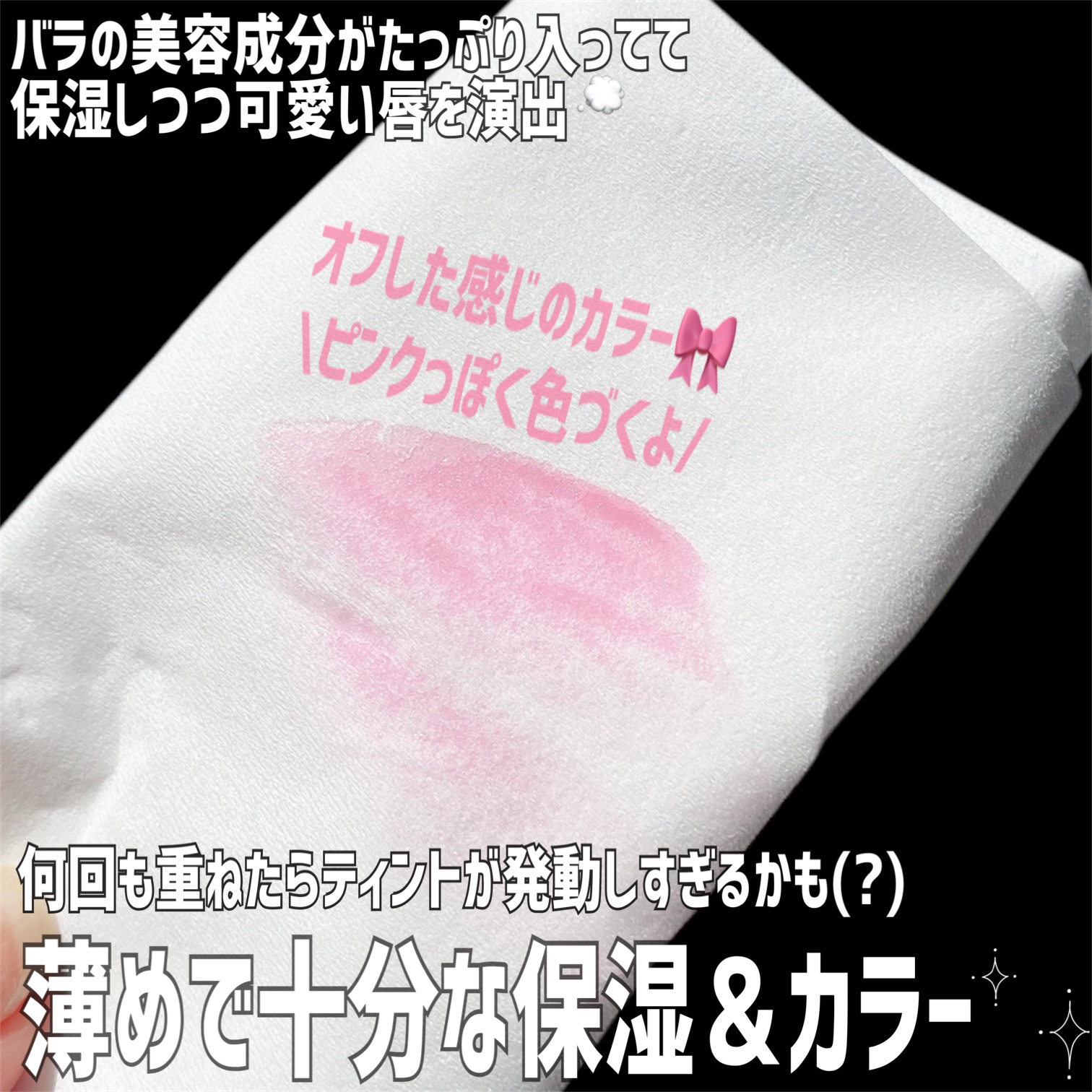 色持ちがかなり良くて、ティント効果あるのかな?公式さんに確認して、ティント効果はないとの返答をいただきましたが、いまだに疑っています笑 かなり強くローズの香りがするので、苦手な方は注意です🤧 可愛すぎるので、ぜひチェックしてみてください~!