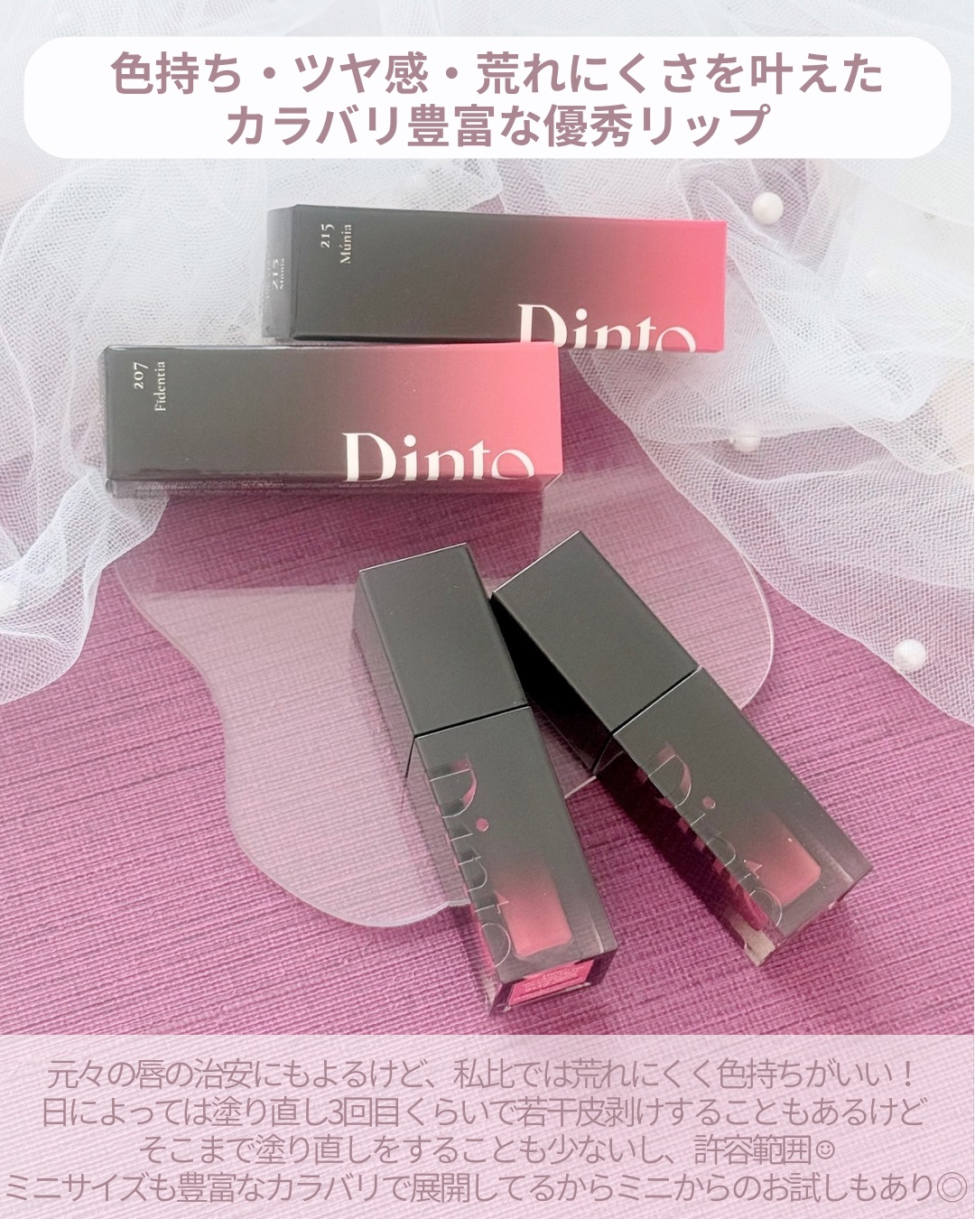 質感がデパコスレベルって思っているブランド Dintoの使い心地がとっても良い、リップティントの紹介です😆💓 使ってみたけど、やっぱり好き〜😆💕 ディント ブラーグローイリップティント 207 Fidentia 210 Reverentia