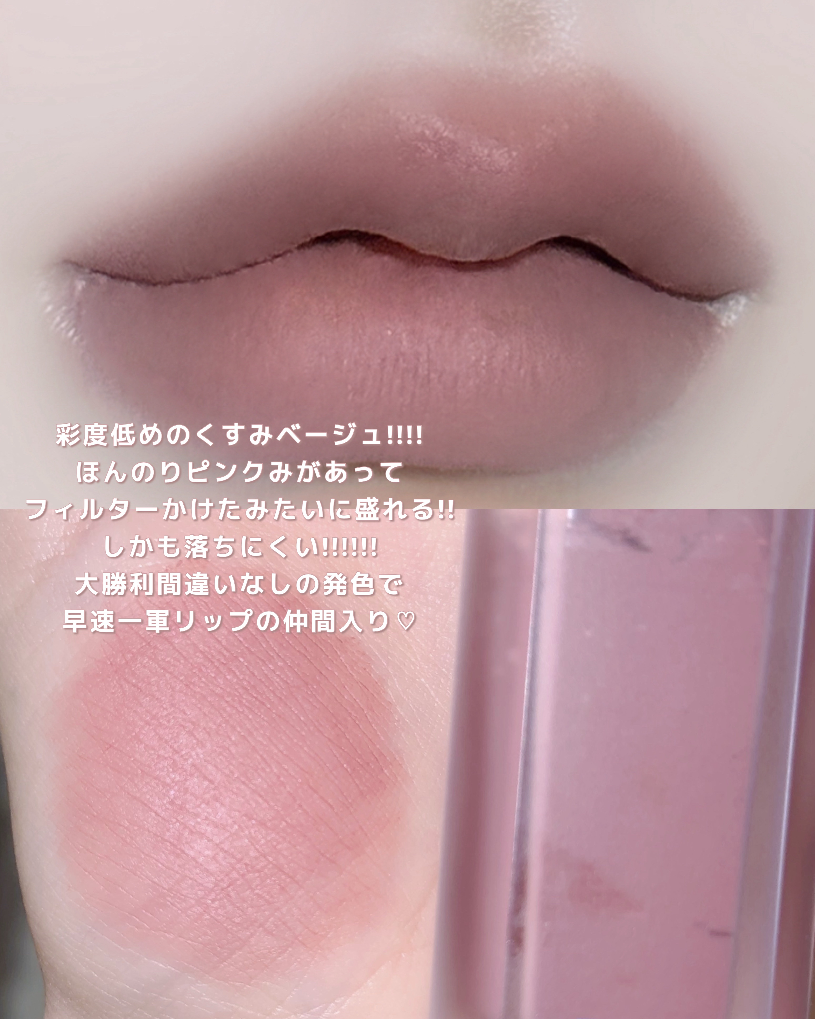 𓊆ྀིVintageCoquette𓊇ྀི彩度低めのくすみベージュにほんのりピンクがあまりにも可愛い…!!!!黒髪大勝利の垢抜けリップ見つけた!!!┈┈┈┈┈┈┈┈┈┈⚪︎BBIAラストベルベットティントV21リアルノート┈┈┈┈┈┈┈┈┈┈リニューアルされてパッケージが変わったよ!!リニューアル前のも持ってて愛用してるカラーなんだけど、色味はそこまで変わらないけど少しだけくすみ感が増えたかも…??色持ちはさらに良くなっててほんとに落ちにくい!!飲み会リップマットで探してるひとはこれ🩰リアルノートほんとに可愛くてお気に入りだからみんな使ってみてほしい、、、ぜひ試して見てください!#私のフェス耐久コスメ