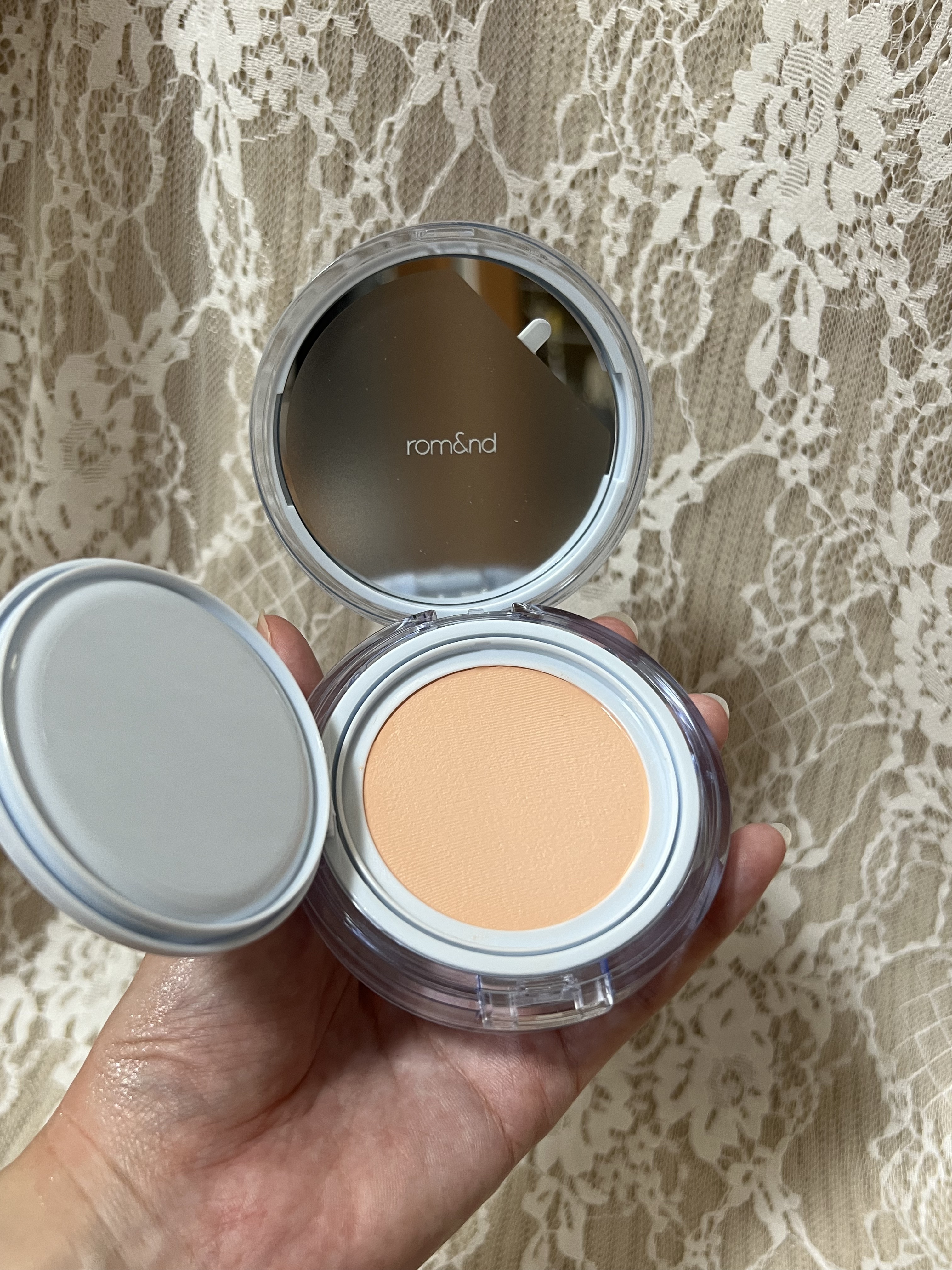 ロムアンドのメッシュファンデ、水分たっぷりで肌が潤いました〜👌🏻💞💞これはリピ確商品です‼️💗ぜひ買ってみてください〜!🫶🏻✨#ロムアンド#ベアウォータークッション#ファンデ#ファンデーション#コスメ