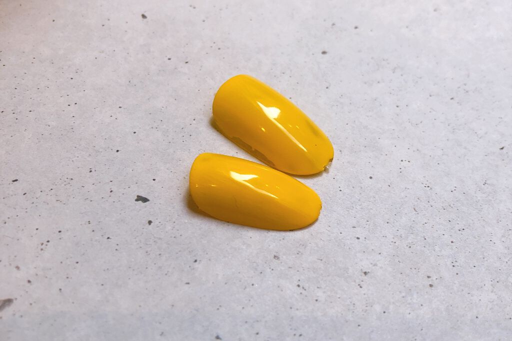 ブルーは二度塗り。 すごく鮮やかなブルーで、一度塗りだと少しだけ色ムラが分かるので、二度塗りがおすすめ。 二度塗りで全然透けません。 イエローはゴールドと合わせる。 先にイエローを爪の半分以上に塗ってから、真ん中で重なるようにゴールドを塗る。 イエローは一度塗りでも二度塗りでもいいけど、ゴールドは適当な透け感が可愛いので一度塗るだけ。 黄色じゃなく、シルバーに寄った感じのゴールドラメ。 キランキラン大粒のラメじゃなくて、ギラギラっと輝くような感じ。 単体で塗ると塗りムラが目立つけど、重ねる使い方なら、その塗りムラのおかげで下のイエローが透けるので可愛い🤘 乾くとゴールドがマットなザラザラになりますが、トップコートを塗れば一気に輝きが増します✨ トップコート二度塗りでツヤツヤさせるのが好き😊