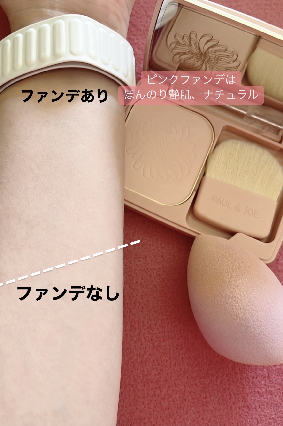 ほんのりパール感ピンク。お直し用に、こりゃ良いわ。 厚塗り感がなく自然なツヤで肌を綺麗に見せてくれ✨ ナチュラル肌です。 ナチュラル肌を、お好みの方にオススメのファンデです
