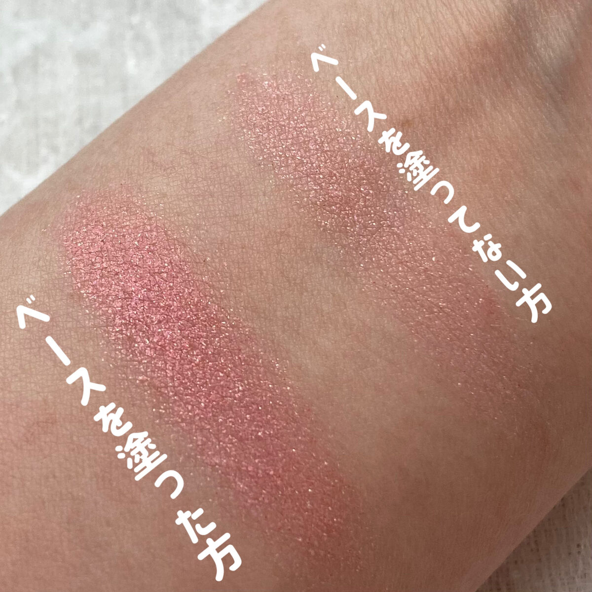 エイヴリーピンクベースに多色ラメがキラキラ✨ サラサラタイプのテクスチャだけど、何度が瞼でワイプすればピタッと密着しました。 ピンクとラメが好きな私にはドンピシャ好みです🫶 フィキシングプライマーなめらかなクリームテクスチャで瞼に乗せるとあまりぺたぺた感はないです。 フィット感がアップするので、ラメアイシャドウの時は使った方が綺麗に発色、長持ちします! プライマー有り無し、メイクの仕上がりの比較は写真の通り。 プライマー無しでもちゃんと発色しますが、持ちは断然プライマー有りでした!