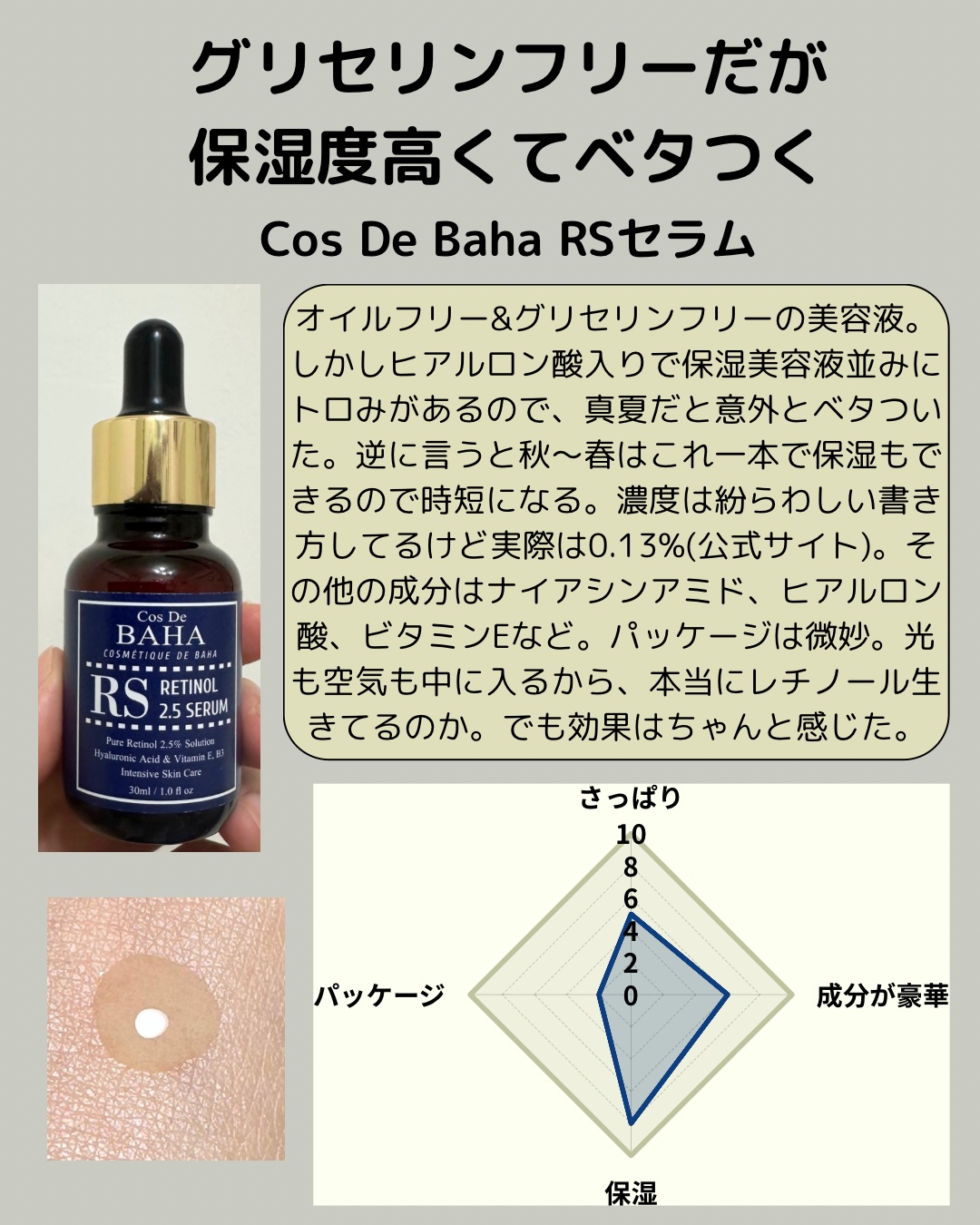 夏用に買ったレチノールセラム。コスデバハRSセラム。使い切り。レチノール化粧品はだいたいクリームの形なので、夏には重たくて使いにくい。しかしこれはなんとオイルフリーでグリセリンフリーの、セラム状のレチノールだったの大喜びで買いました。これが私...