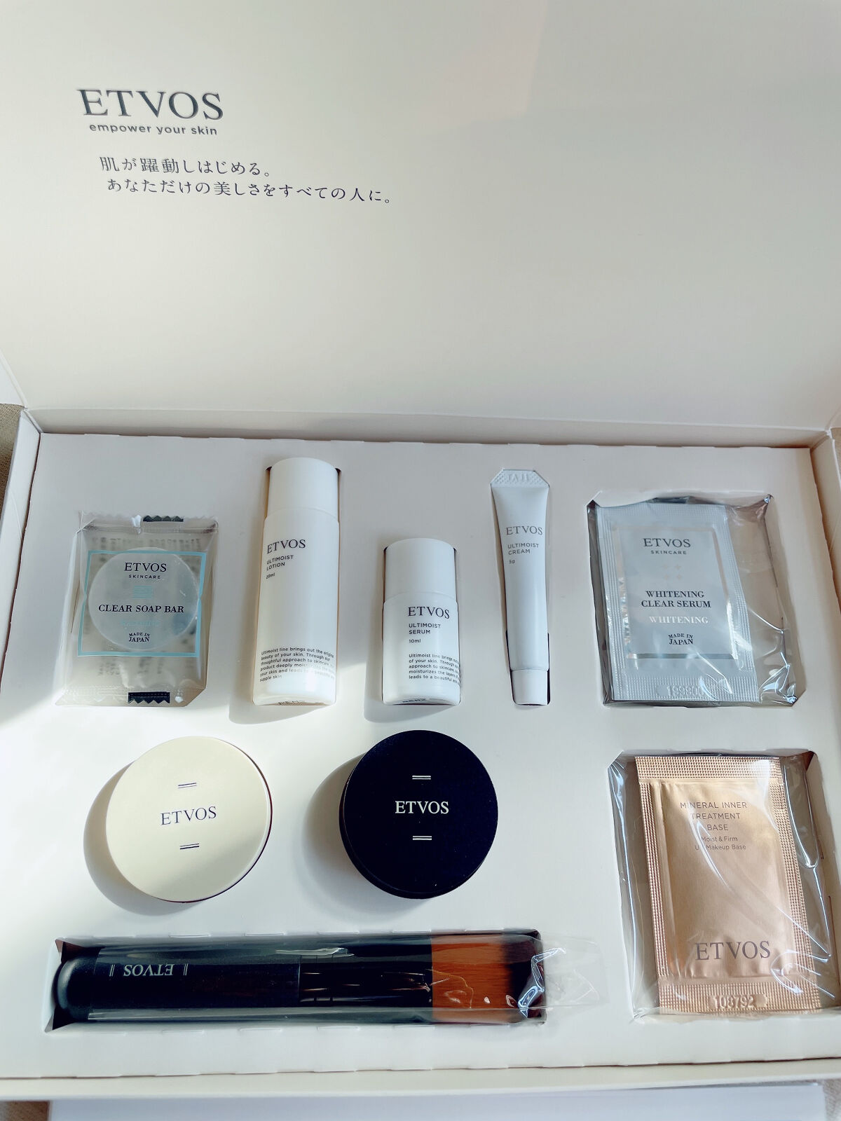 ETVOSのパーフェクトキットを公式サイトから購入してみました!Instagramでめちゃくちゃ広告見て、その流れで購入です🥹💦初回でもらったポイントがいきなり使えたので、元値1980円から1580円まで値引きしてもらえた!届いての第一印象、めちゃくちゃ色々な種類のものが入ってるな〜という感じ!❤️感想◎クリアソープバー私は泡立てネットを持っていなかったので素手で泡立てた感想になりますが、水だと全然泡立たなかったけどお湯なら泡立ちました😂✌️洗い上がりはさらっとしててヌメヌメしないのはよかった!でも個人的には泡で出てくるタイプか、手のひらでも泡立ちがいい洗顔料が好みなのでリピはないかなぁ…◎アルティモイストローションしっとりめの化粧水さらっとしてるけどしっとりした肌になる◎薬用ホワイトニングクリアセラム3袋も入っててたくさん試せてよかった!半透明のジェルっぽい質感で夏にもよさそう。◎アルティモイストセラムしっとりめになるベタベタしないので使いやすい◎アルティモイストクリーム重めのクリームこれだけだと正直伸ばしづらいので、アルティモイストセラムが手のひらに残った状態で顔に乗せる方がなじませやすかった全然減らないから今のところ一番使ってる。朝使うと夜までしっっとりしてる。出した時はベタベタした感じなのに気づくともっちりって感じになります。◎ナイトミネラルファンデーション◎マットスムースミネラルファンデーション◎フェイスかぶきブラシ最初はブラシに塊でついてしまう粉に苦戦した。蓋の上でブラシと馴染ませるときに粉が舞うので、黒い服着てる時は注意。めちゃくちゃ蓋でくるくるしてると塊は無くなるけど、めちゃくちゃ粉が舞う。最初は粉っぽくてうまくカバーされてる感じはしないのに、少し時間が経って顔に馴染んだ頃になぜか毛穴がきれいにかくれてた。まじでいつのまにか顔に馴染んでる感じ。ただそういう感じなので、つけてる時にいつまでつけていいか分かりづらい感じです。粉なのに全然乾燥しない。しっとりした肌になる。質感的には秋冬のこれからの時期に良さそうだと思った!パウダーなので持ち歩くのは難しいからお直しには向かない感じ。ブラシも意外とでかい😂◎ミネラルインナートリートメントベース下地しっとり系。トーンアップはするけどめちゃくちゃ明るくなる感じではない。これだけでカバーという感じではない。せっけんで落とせるので肌に優しい感じはする。ベージュとラベンダーベージュの2種類お試しできてよかった!個人的にはベージュの方がカバー力を感じた。肌に優しい感じはするので、これから用に下地だけはリピしようかなと思ってます!#エトヴォス#エトヴォスパーフェクトキッド#秋冬メイク2023