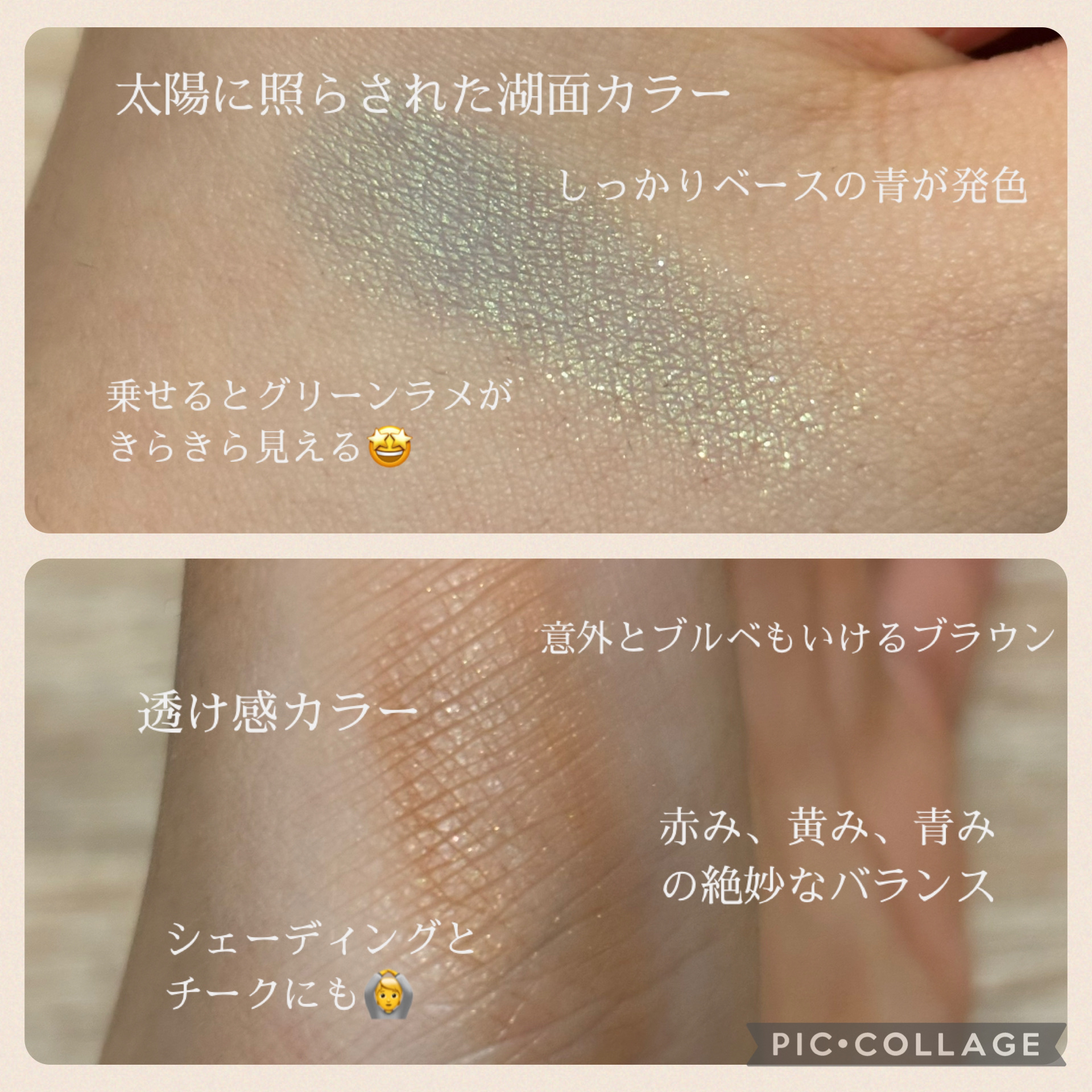 肌に溶け込むようになじむ ニュアンスカラーで使いやすい 青み、赤み、黄みのバランスが良いので肌色を問わず使いやすいブラウンのフェイスカラーは、光が当たるとスパークルゴールドパールがチラチラして可愛い☺️ 溶け込んでさりげなく存在をアピールするカラーだから、アイシャドウやチークの下地にしたり、淡めのカラーが浮かないよう調整役として使うのも有り◎ おだやかな発色で重ねるとだんだん深みが増すので、自分好みにバランスを取って使えるところも良かった✨