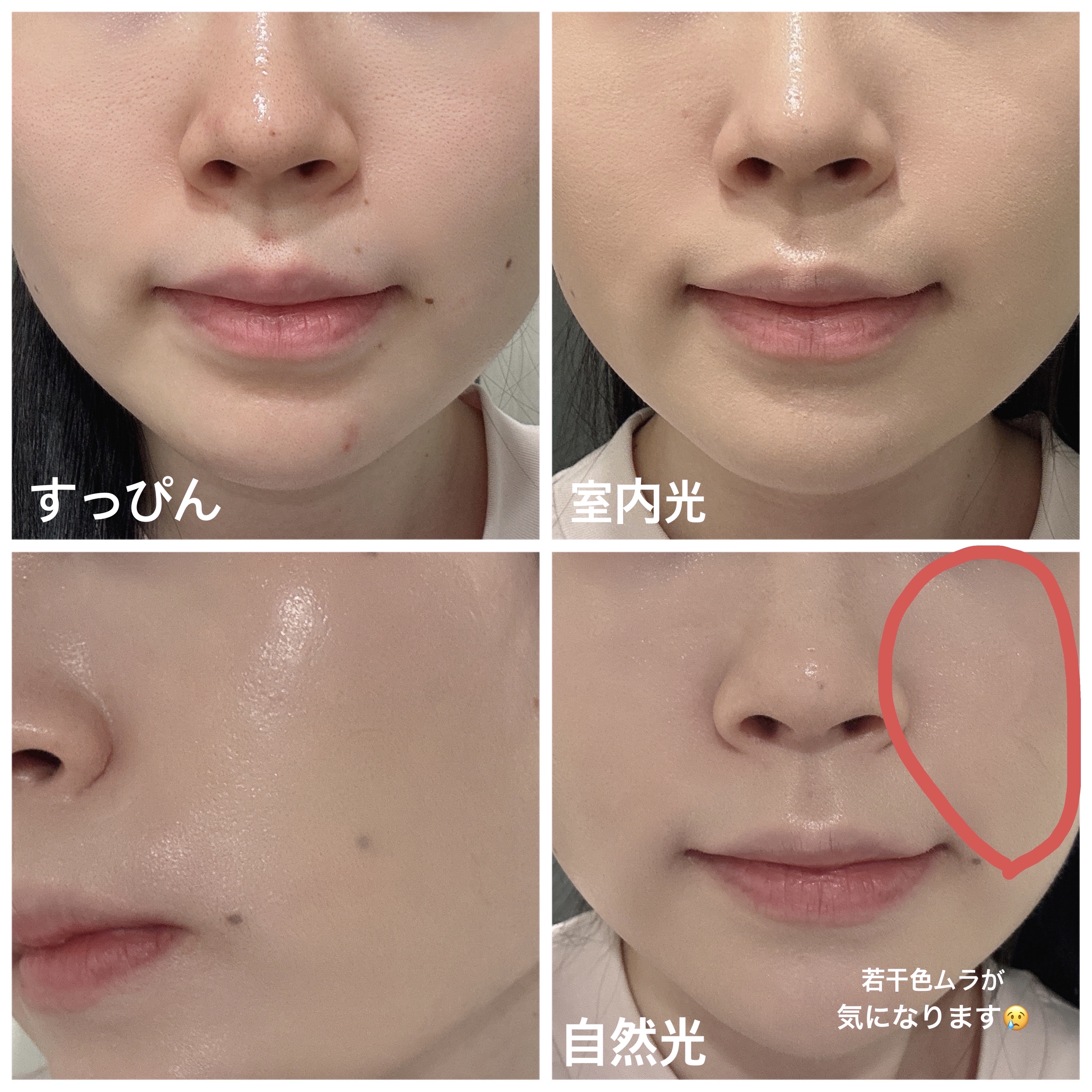 ちょっとツヤで頬が光る程度のセミマット 透け感の淡いピンクで可愛いけど容器分厚いから持ち運びには向かない 毛穴カバーできるけど赤みやクマはカバーされない 時間が経つと頬ガサガサになる😢