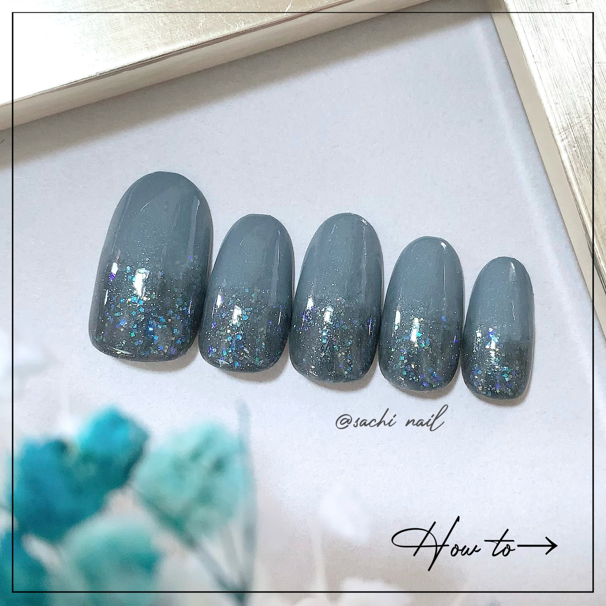 やり方は画像を参考にしていただければと思います♡ 境目をぼかす時は、爪先方向に向かって軽くトントンとぼかしてあげると🙆♀️ 境目が多少目立ってしまっても、最後に塗るラメで誤魔化せるので気にしなくてもOKです🫶