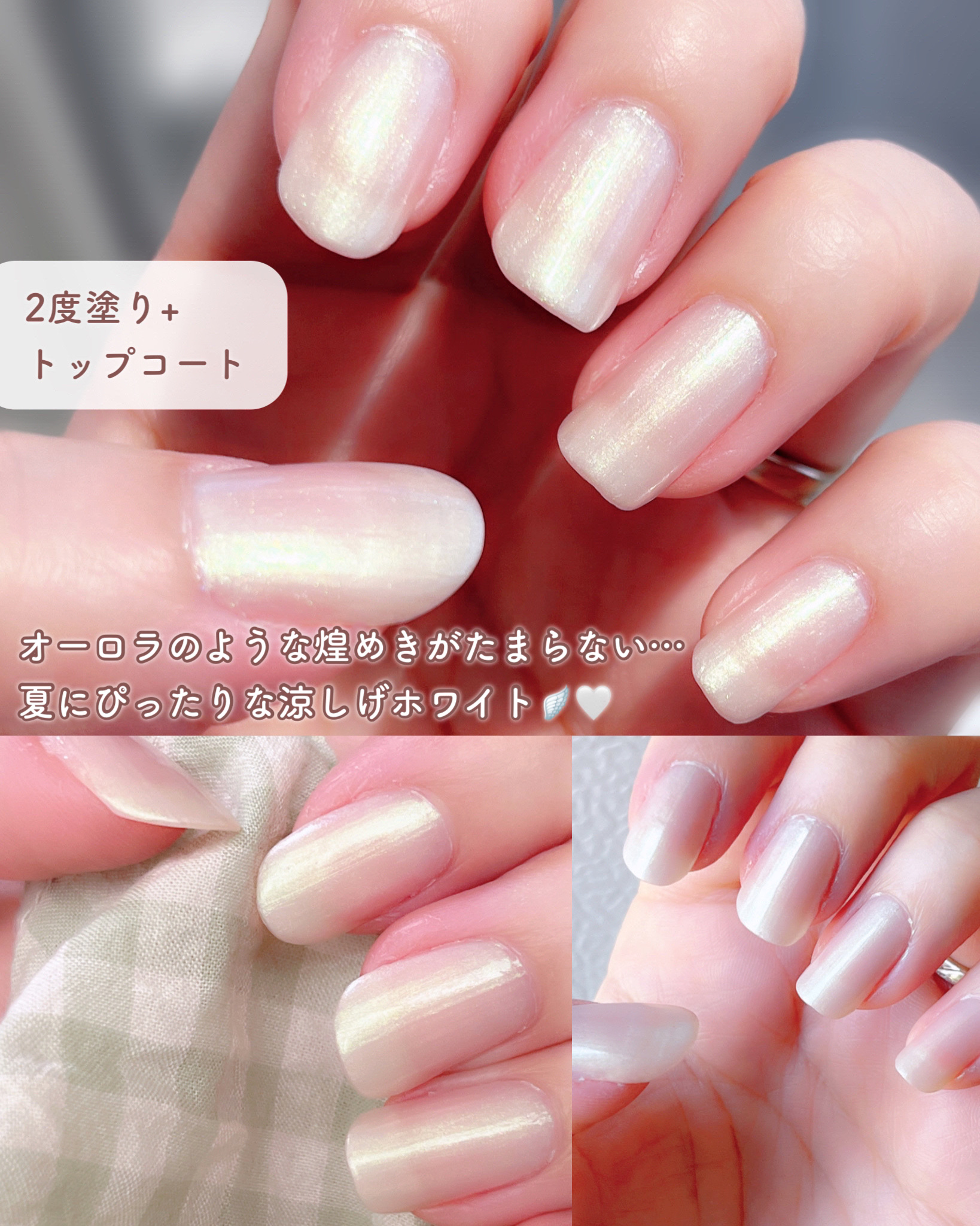 ネイルサロンでジェルでシングルカラーネイルをしてもらった時みたいにちゅるんと綺麗な ネイルがセルフでできました♡ このRWN-03のカラーはホワイトベースにパールが 入っていてオーロラみたいな輝き🪞✨ 夏にぴったりだし、ちゅるん感と輝きが相まって 透明感抜群🫧🤍