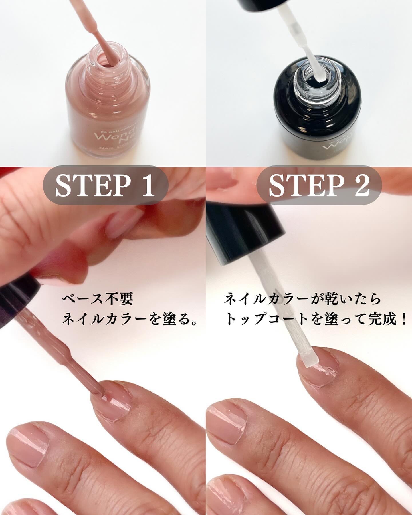 自爪の凹凸をしっかりカバーするポリマー原料を配合していて、速乾のネイルカラーでありながら塗りやすくジェルのような滑らかな表面に仕上げてくれるネイルポリッシュなんですって! ハケを変更したことにより従来製品より塗りやすくなっているとのことで、これが本当に塗りやすい♪ 爪に優しい処方でベースコート不要・自爪に直接使用できちゃうのも嬉しいところ! さっと2度塗りプラス、ワンダーネイルのトップコートで仕上げてみました♡ ツヤのある、滑らかな仕上がりに大満足! なによりとても早く乾いてくれるから、ネイルに使う時間が短縮できるのがとっても助かるー! 選べるカラーも豊富なワンダーネイル。 自然にツヤのあるネイルを叶えてくれるワンダーネイルはとっても使いやすくお気に入りのネイルポリッシュです𖧷