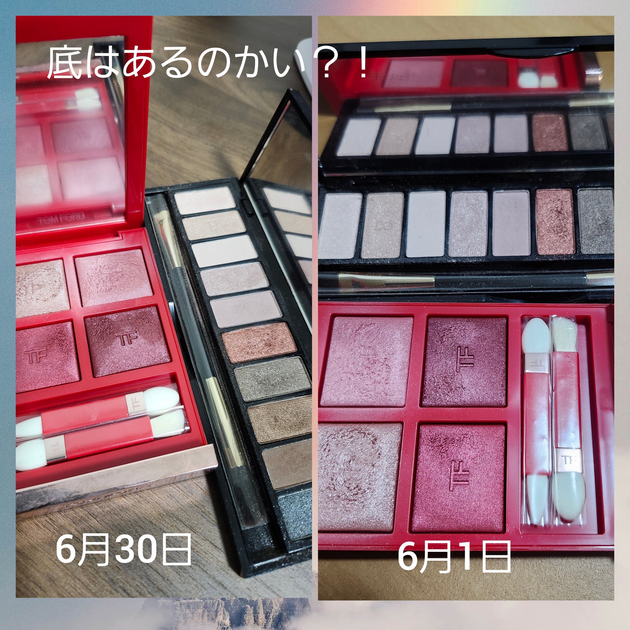 🌿🌿6月使いきり活動。。無理なんじゃ。。💦💦🌿🌿#DOLCE&GABBANABEAUTYアイラブドットこちらはまじで筆推奨特に濃いカラーチップやら筆で着けたらバンッとついて大変よーだけど、粉質がいいのでブレンディングはしやすい#TOMFORDBEAUTYアイカラークォード01SCエレクトリックチェリー限定色トム・フォードの中ではかなーり穏やか発色系カラー😅💦これでも浮気せず毎日毎日どっちかしか使ってないんだけど。。この微動だにしない感じ減った。。。??🌿🙃泡立てて洗い流すもんに金はかけないが見た目をアップデートしてくれるものに妥協しないと結果長持ちする、。。気がしてますあくまでも私見で根拠なき感想ですが。。クレンジング、ボディソープに洗い流す!落とす!ちょい突っ張らせないための処方以上のが入っててもさ。。爆速で水で流すのにレチノールとか入れたとて意味は💦ドラコスで十分やろ!スキンケアもニンジンパット顔面にはるよりニンジンを夜食にたくさん食べた方がニキビ出来なくなったけど。。なんて、だんだんアイラブドラコス‼️!💕💕なんですが。。アイシャドウとかファンデーションはデパコスのが付加価値が高い気がします(笑)特に40歳にもなると。。しかし。。失くならない💦😅🕶アイシャドウパレットはこれくらいカラーストーリーがとっちらかってるほうが好き似たようなカラーを集めたアイシャドウパレットって。。つまんにゃい。。って思っちゃうんです😅💦好みの問題ですね