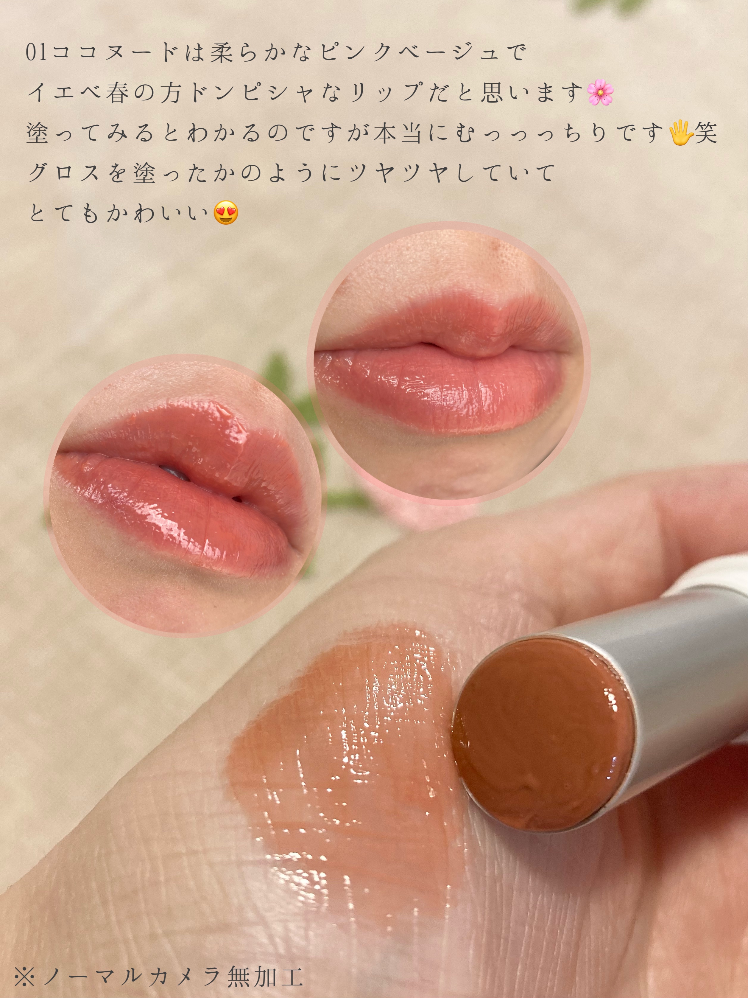 この色本当にかわいい! やわらかいリップクリームみたいにスーっと塗ることができ、そのあともうるうるが保たれます☺️ 01ココヌードはオレンジベージュなのでイエベの方合うと思います🍊 口唇炎ができやすいわたしも荒れずに使えています!