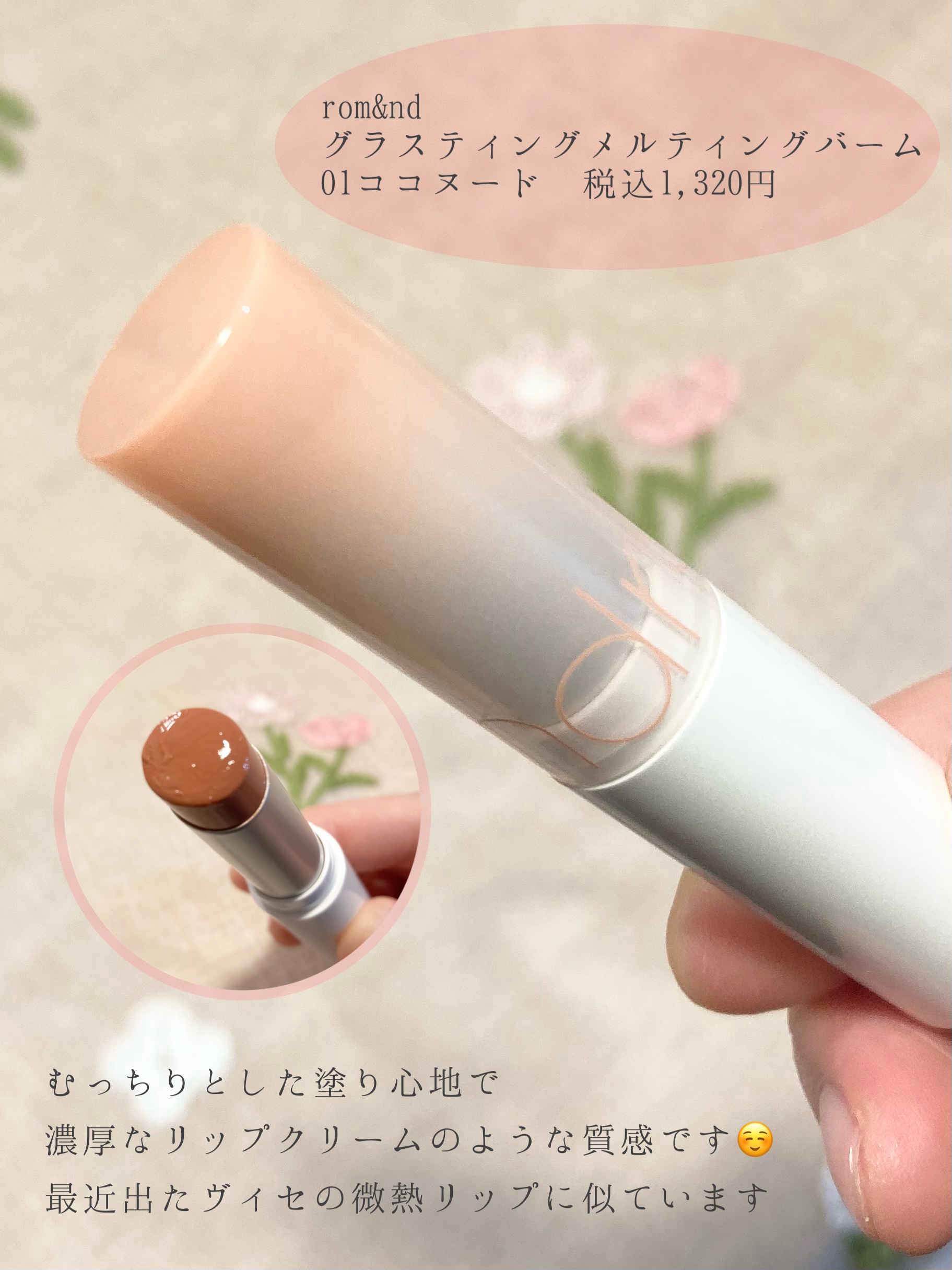 rom&ndグラスティングメルティングバーム01ココヌード❀❀❀やわらかなアプリコットベージュ春秋イエベの方にオススメ★❀❀❀めちゃくちゃ愛用しています♡❀❀❀唇にのせた瞬間から色、質感がとても気に入りました!!♡♡♡❀❀❀しっとりもっちりで...