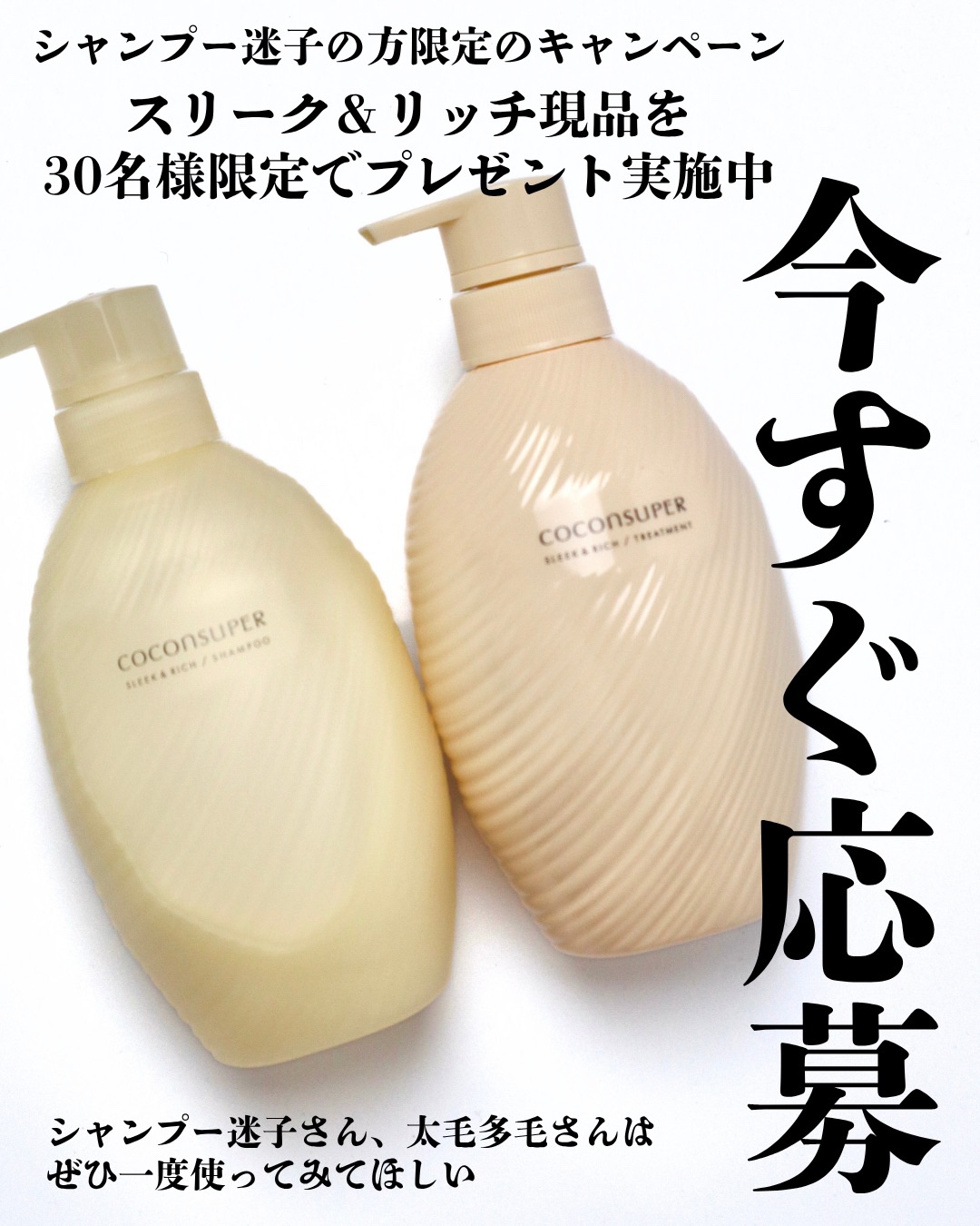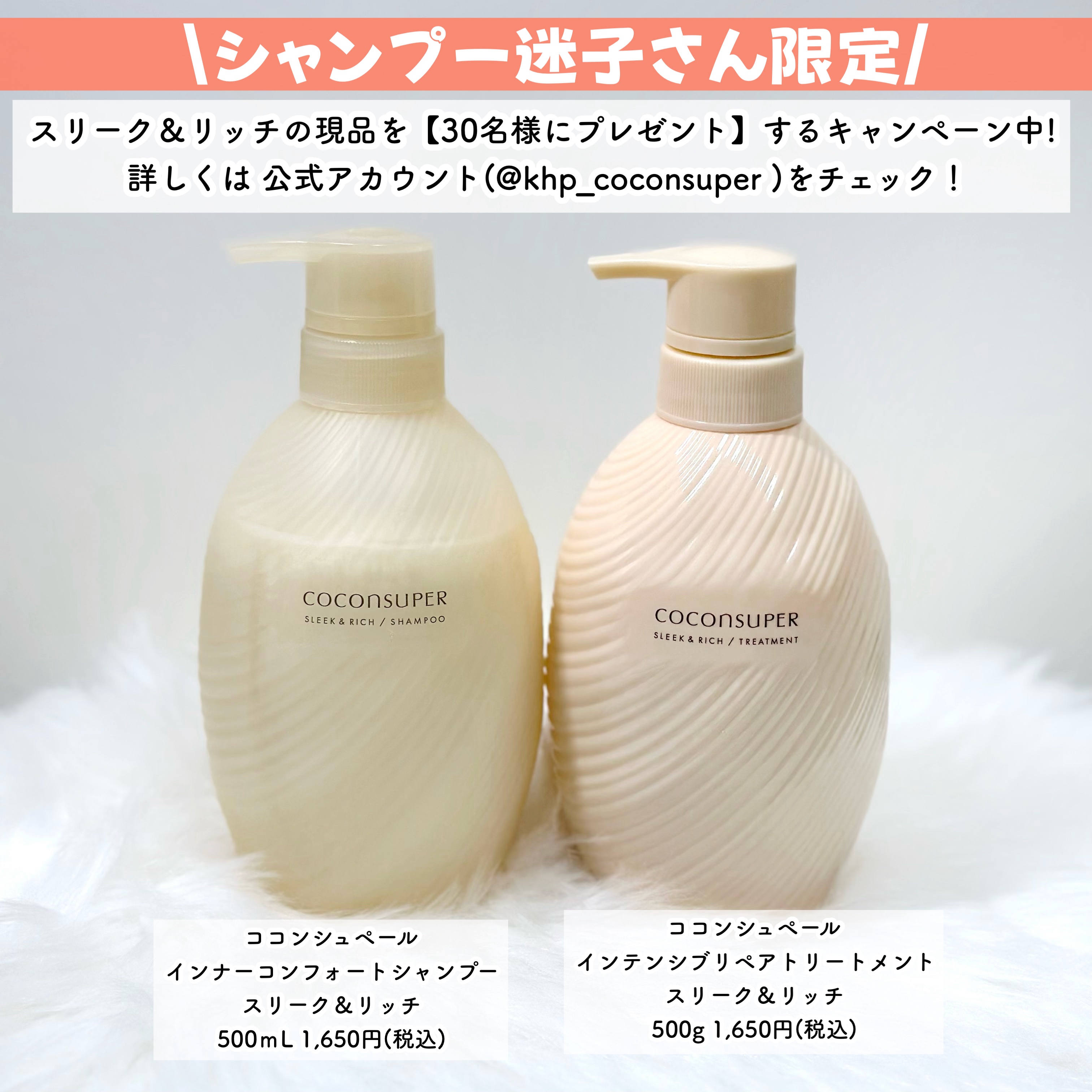 あっ!するん。シルクのような艶感。/シャンプー迷子の私が出会ったなめらか質感!髪が細くてうねりやすく、湿気が多い日は広がって大変…。そんな「シャンプー迷子」だった私。気になってた「ココンシュペール」を使ってみたらめっちゃ良かった!3種の選べる艶髪になれるラインナップ!この「ココンシュペール スリーク&リッチ」はシルクのようななめらかで光沢あふれる艶髪へ導くシャントリ!髪の内と外のダメージを補修して、表面をコートするからつるつるの艶髪になれるんだってー!【シャンプー】———-♡——————–♡———ココンシュペール インナーコンフォートシャンプー スリーク&リッチ 500mL1,650円(税込)———-♡——————–♡———クリーミーな泡立ちのノンシリコンシャンプー♪キメ細かい濃密な泡で気持ち良い洗い心地♡泡切れもよくて、流したあともしっとりの指通りが気持ちいい〜!【トリートメント】———-♡——————–♡———ココンシュペール インテンシブリペアトリートメント スリーク&リッチ 500g1,650円(税込)———-♡——————–♡———リッチなテクスチャーでしっかり根元から毛先まで密着!しっとりとなめらかな仕上がりに♪しっとりツルンとした仕上がりに感動ー♡アクアティックホワイトブーケの香りもめちゃくちゃお気に入り!!可愛らしさと透明感を感じる香りで、バスタイムが幸せ時間に♡シャンプー迷子さん限定/スリーク&リッチの現品を【30名様にプレゼント】するキャンペーン中!詳しくは公式アカウント(@khp_coconsuper)をチェック!なめらか&艶感お手入れをしたい人はココンシュペール♪私はウエルシアで見つけたよー!ぜひぜひチェックしてみてね!@khp_coconsuper#PR#COCONSUPER #シャンプー迷子 #ココンシュペール #艶髪 #シルク艶髪#するんシルク艶髪 #するんとつやめく毎日を