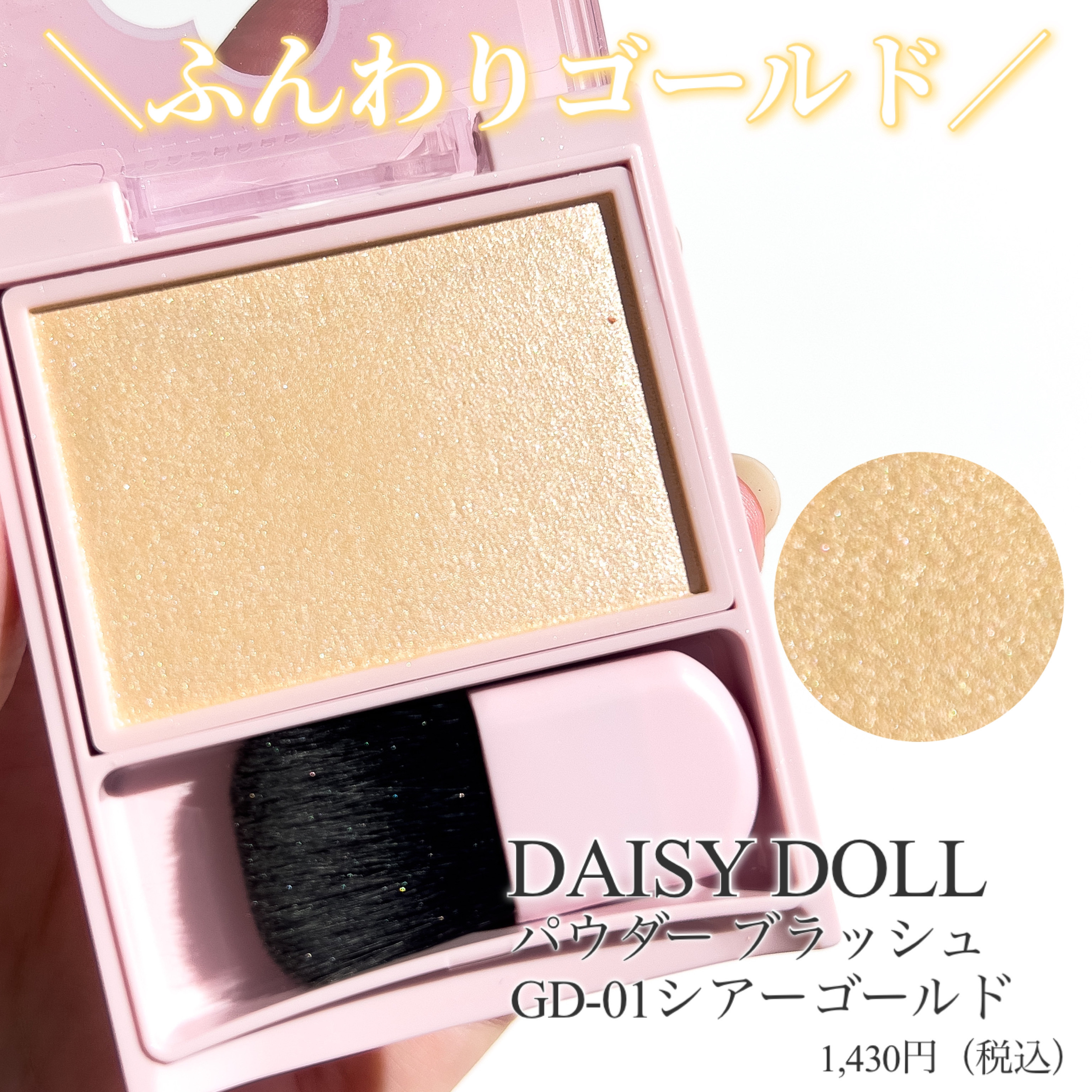 DAISYDOLLbyMARYQUANTパウダーブラッシュ【使った商品】GD-01シア―ゴールド【商品の特徴】¥1430円(税込)8.3g全8色ブラシ付属潤い持続ソフトフォーカス高密着パウダートリプル美容オイル配合パール入【使用感】パケだと黄みの強そうなハイライトサラッとしているので粉含みが良い実際に塗布すると黄み感はありつつも意外と控えめ顔に塗布する際はあまり分からないキラキラしつつも肌に馴染む輝きで艶肌だと分かりづらいかも逆に言えばナチュラル仕上がりでもある黄み肌、ピンク肌問わず割と馴染むゴールドカラーで他の化粧と喧嘩しづらく合わせやすい【良いところ】パケが可愛い肌馴染みの良いゴールドカラーナチュラルな輝き【イマイチなところ】特に無し【どんな人におすすめ?】普段使いしやすいハイライトをお探しの方ベースの色味問わず使えるものが好ましい方ナチュラルな立体感が欲しい方お勧め【使い方】鼻先や鼻根にブラシで塗布眉尻の立体感にもお勧め頬は目立ちにくいのでマット肌じゃないと分かりにくいかも名前通りシアー感あるので使いやすくベースの色やカラーメイクとも合わせやすい#プチプラコスメ#プチプラ#ハイライト#デイジードール