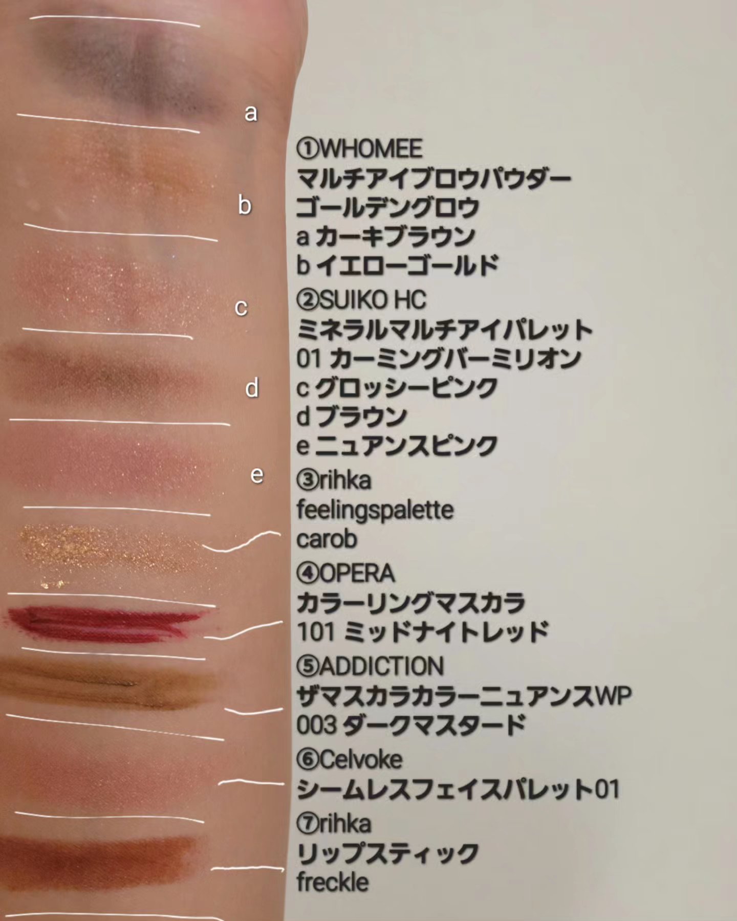 こんにちは🌞やっと、夏休みが終わりました~!!届いたばかりのrihkaのブラウンリップで少し夏の終わりから秋っぽさも感じるようなメイクを💄とはいえ、9月もまだまだ残暑が厳しいみたいですね💦早く涼しくなってほしいですね🍂■makeupアイブロウは①#WHOMEE#マルチアイブロウパウダーゴールデングロウのaカーキブラウンを眉尻中心に。bイエローゴールドを眉頭から全体に。アイメイクは②#SUIKOHC#ミネラルマルチアイパレット01#カーミングバーミリオンcグロッシーピンクを上瞼全体に。dブラウンを二重幅に。eニュアンスピンクを下瞼の涙袋に。③#rihka#feelingspalettecarobを上瞼の目尻側にラフに乗せて✨④#OPERA#カラーリングマスカラ101ミッドナイトレッドを上睫毛だけに。⑤#ADDICTION#ザマスカラカラーニュアンスWP003ダークマスタードを下睫毛に付ける。チークは⑥#Celvoke#シームレスフェイスパレット01の血色カラーを頬に。リップは⑦rihkaリップスティックfreckleをしっかりと💋✨上瞼の目尻のゴールドグリッターと涙袋のピンク、赤色の睫毛とブラウンリップ、と色々欲張ってますが(^皿^ゞまとまりのあるメイクになりました🤗rihkaのブラウンリップが新鮮で可愛くて使う度にワクワクしてます🤎#ファッション好きな人と繋がりたい#メイク好きさんと繋がりたい#メイク好きな人と繋がりたい#コスメ好きさんと繋がりたい#コスメ好きな人と繋がりたい#ちひろのメイク#メイク#メイク好き#コスメ好き#rihka_lip#リーカ#rihka_eye#ブラウンリップ