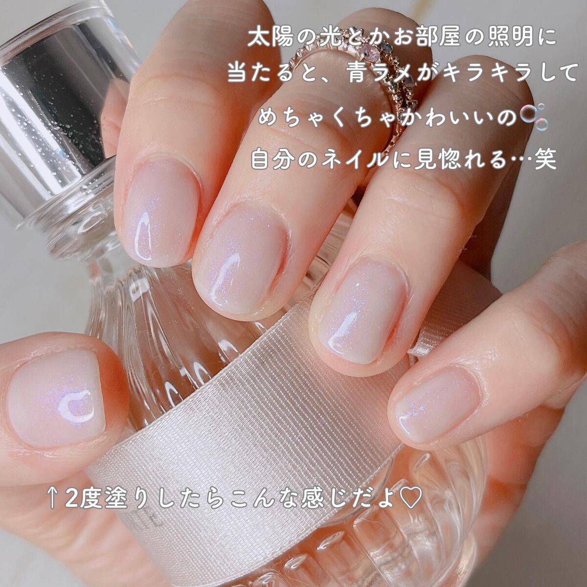 シアーなホワイト×ぎっしり青ラメ この組み合わせ神ですかぁ🥹🪞 青ラメのおかげで、私の短い爪たちも 儚げな感じに見える(気がする)← これは2度塗りしてて、1度塗りだと もっとシアーに仕上がるよ🌸 練乳っぽい感じかな?私は2度塗りが好き🫶🏻 春の数量限定色みたい!! オフィスにも使いやすそうだし おそろいネイルしましょう〜💅🏻🤍