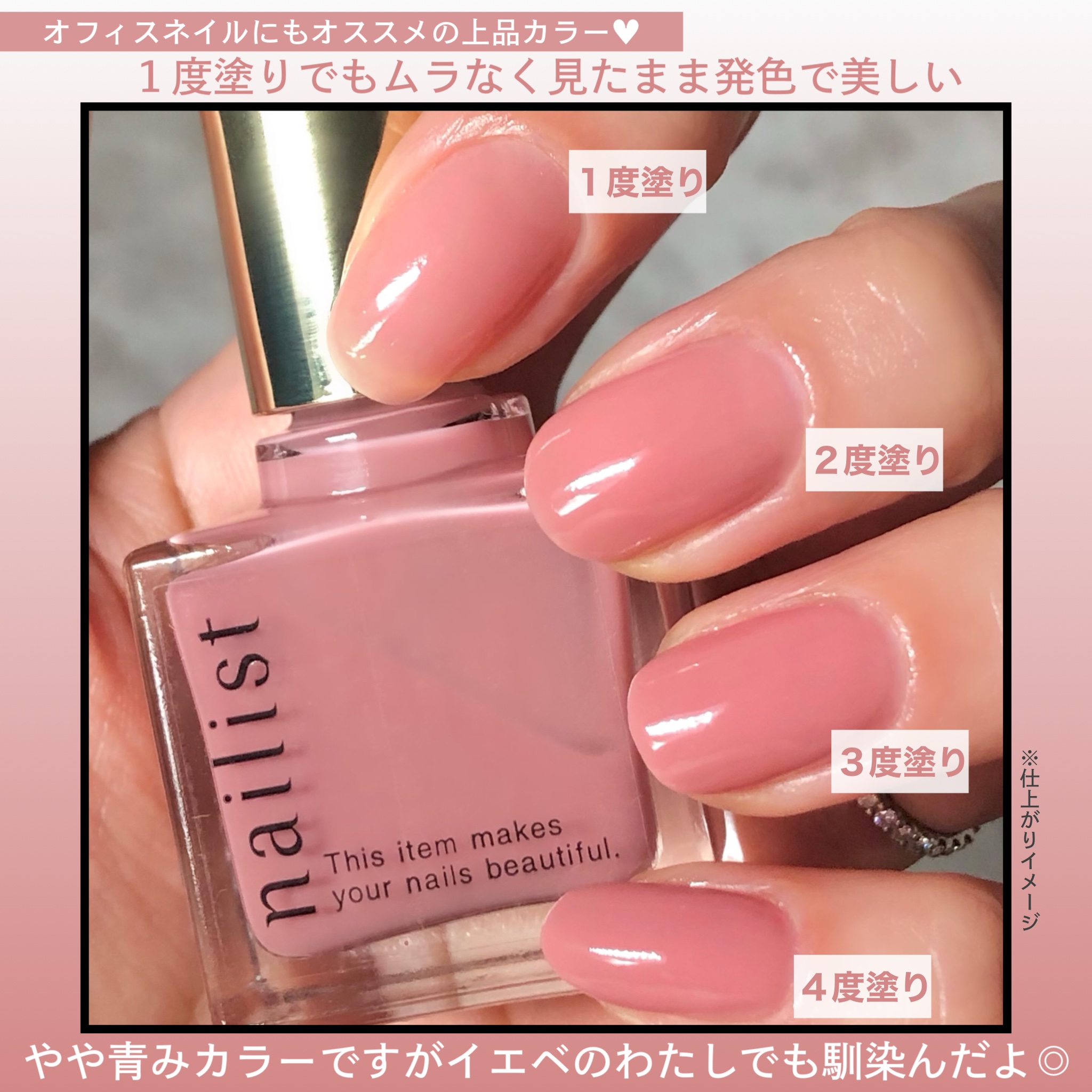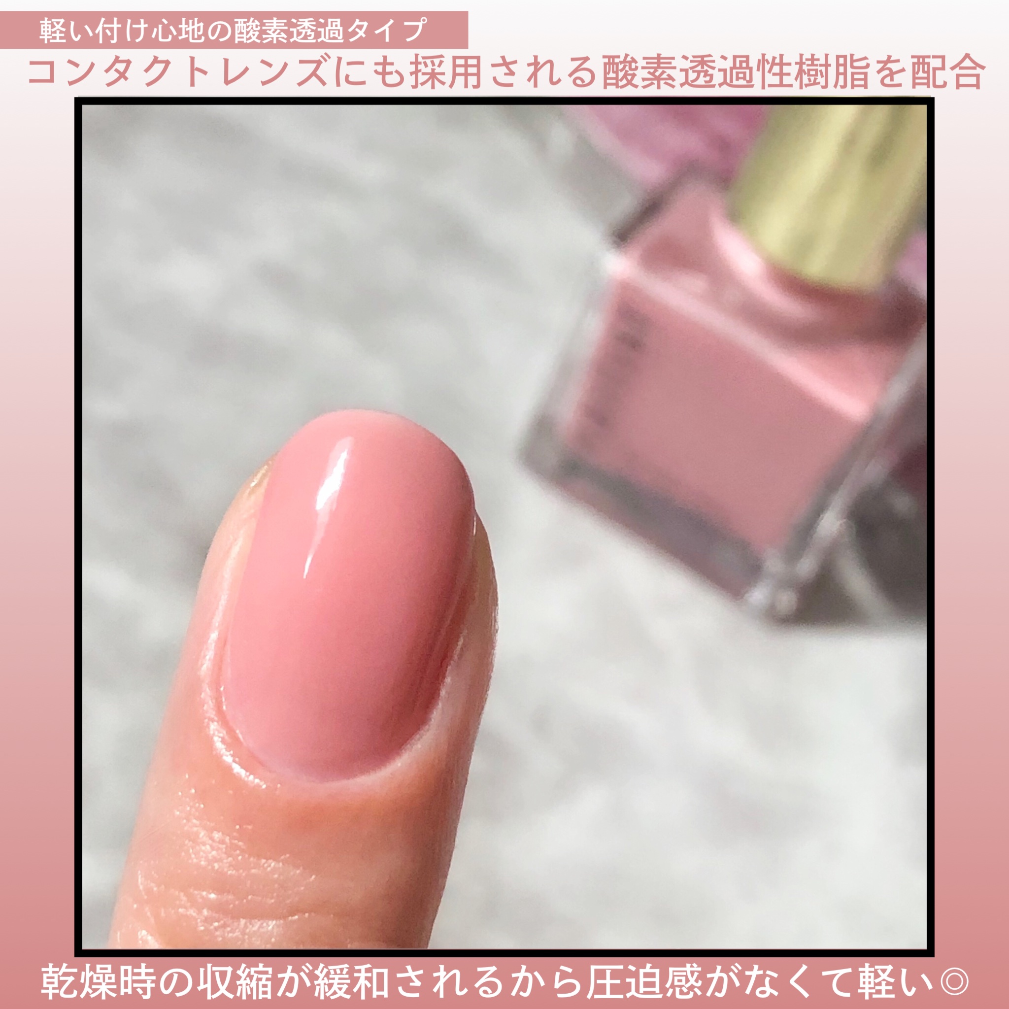 まず使って思ったのが乾くのが早い!! しかもムラになりにくいから 不器用さんやネイル初心者さんにもオススメ◎ 速乾✖️ムラなく仕上がるおかげで 忙しい時でも時短でネイルができちゃう👏🏻 さらに、コンタクトレンズにも採用されている 酸素透過性樹脂を配合していることで ネイルをした時のキュッとした締め付けを感じにくく 2度塗りしても軽い付け心地😳 今回登場した新色は青みピンクだけど イエベのわたしでも浮かずに馴染む 上品なカラーだったので パーソナルカラー問わずオススメ🙆🏼♀️ オフィスネイルにもぴったりなカラーだよ💖