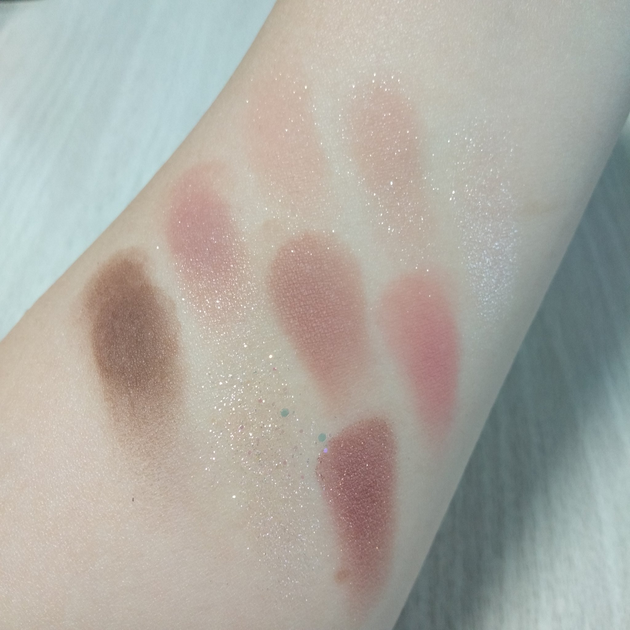 去年の誕生日に愛方ちゃんからいただいたアイシャドウパレットです。今更ながらスウォッチ🥹💕 やはりピンク系のアイシャドウが好きです。可愛いものは可愛い!こちらは極端にくすみカラーというわけではないので使いやすそうです。 腕に出した限りでは発色もしっかりしています。