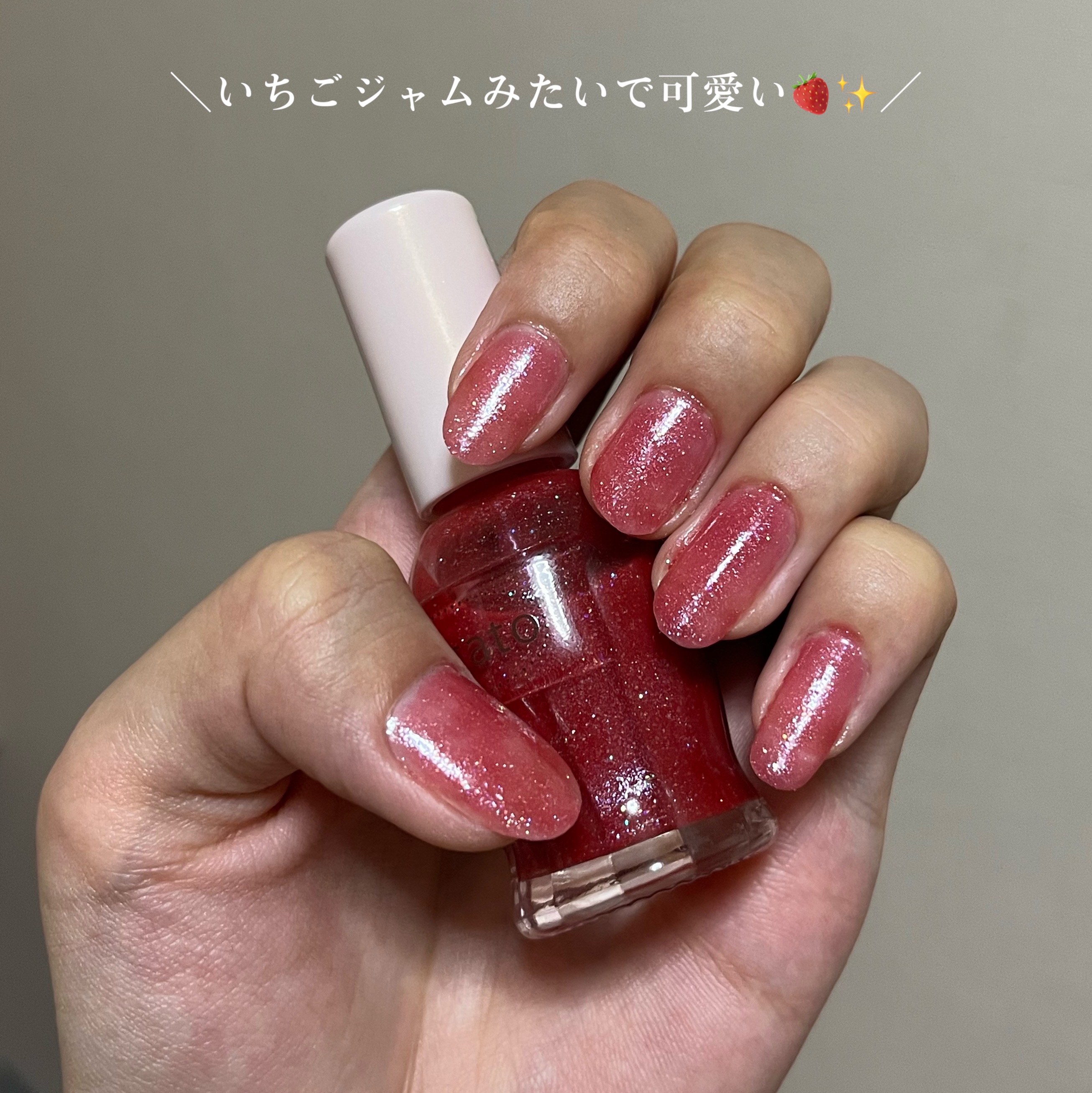 イチゴシロップって名前から可愛い🍓 いちごジャムみたいな甘さのある赤色に お砂糖みたいないろいろな色のパールが入っていて めちゃくちゃ可愛いすぎる! キラキラだから夏のフットネイルにも似合いそう✨