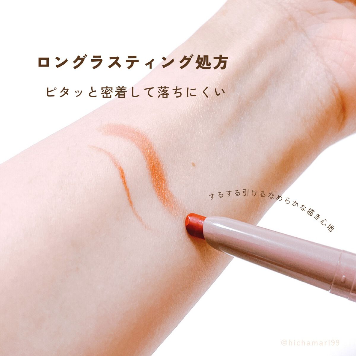 ロングラスティング処方でピタッと密着し落ちにくく、美しい仕上がりが持続します. 透け感発色と絶妙なくすみ色で肌に馴染みやすく自然な仕上がり✨️ 斜めカットが特徴的で、するすると滑らかな描き心地𓂃 𓈒𓏸𑁍 使用方法は…… 1 上唇がのM字や口角を整え、まるみを意識して輪郭を描く 2 唇全体にムラなく塗布し仕上げる パッケージもシンプルなデザインがステキ