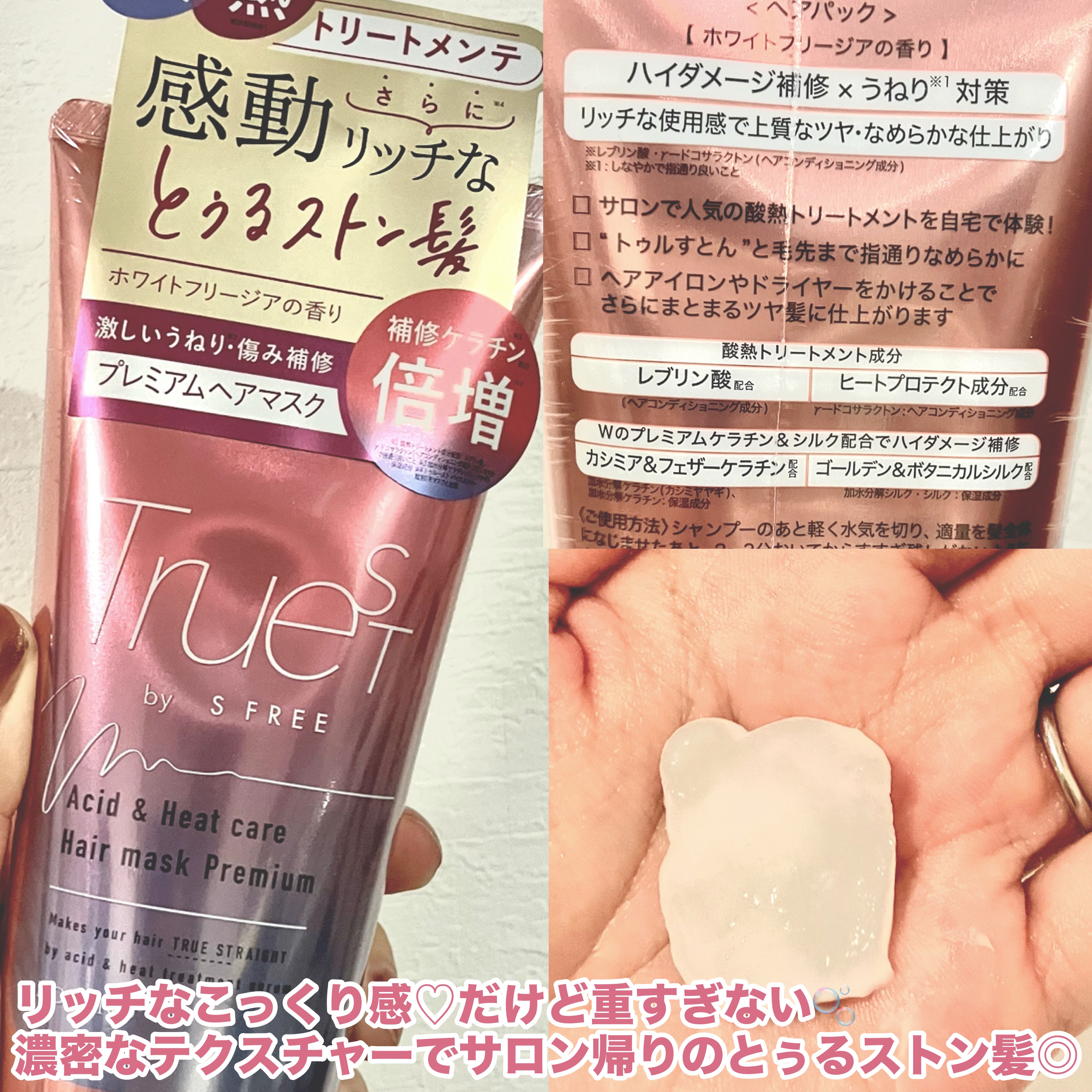 🩷New🩷トゥルーストのWeb限定新商品でプレミアムが登場しました🫧✨️🩷酸熱TRシャンプープレミアム泡は濃密でモコモコ🫧泡切れが良いので好きなシャンプーでした♡キシキシ感がないけど汚れはしっかり落ちている感じでした◎🩷酸熱トリートメントしっとりまとまるけど重すぎないので細毛の私でも使いやすかったです✨️シャンプーとトリートメントだけでも充分とぅるストン感がありました◎🩷酸熱TRヘアマスクプレミアムこっくり濃密なテクスチャー🫧だけど重すぎないから使いやすい✨️髪が柔らかくなる感じがとても良かったです◎ライン使いすると次の日もホワイトフリージアの香りがほんのりしてとてもいい香りでした❁⃘*.゚プレミアムの香りは、デパコスのスキンケアや化粧品でよく嗅いだことのあるような香りでさすがプレミアム🩷となりました🥹私の髪はうねりやすくてよく巻いてるの?と聞かれるくらいクネクネしてくるですが、このプレミアムラインを使うとうねりが落ち着いてストンとまとまってくれるのでびっくりしました🥹🙌サロン帰りのような髪が毎日のホームケアで出来るのでオススメです✨#PR#酸熱トリートメント#髪質改善#ダメージケア#うねり髪#梅雨に負けない前髪#つや髪#トゥルースト