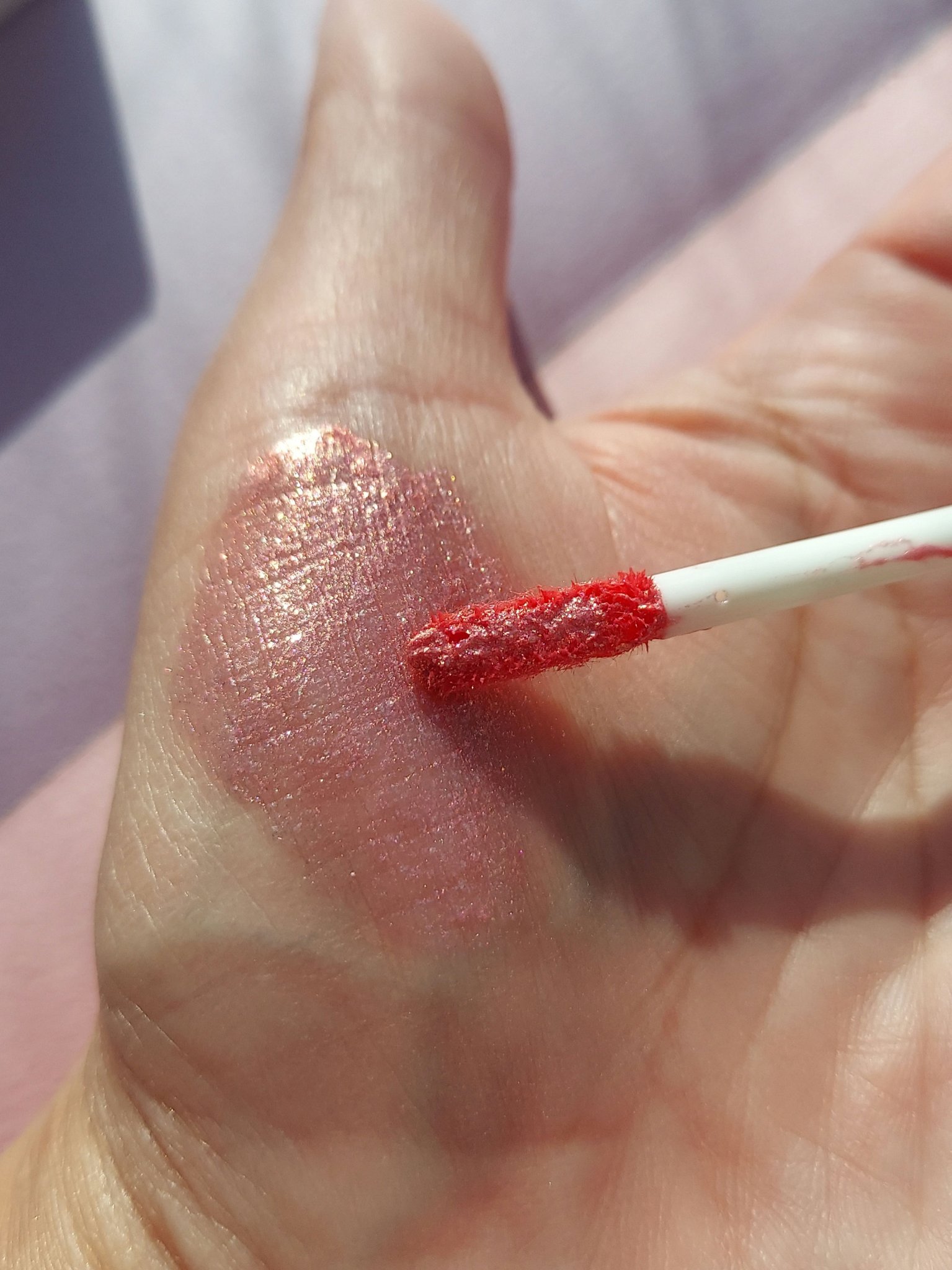 桜色の華やかさはありますが、青みすぎない上品なピンクが特徴的👀 ラメ感はしっかりありますが、そこまで浮かないのではないかと思い購入しました 涙袋のグリッターとしても使える色味なのでアイカラー以外の使い道もありそうです🎀 チップ型は広い面にはおすすめですが、細かい部分はさらにブラシに取って使用すると綺麗に仕上がるかなと思います🌷