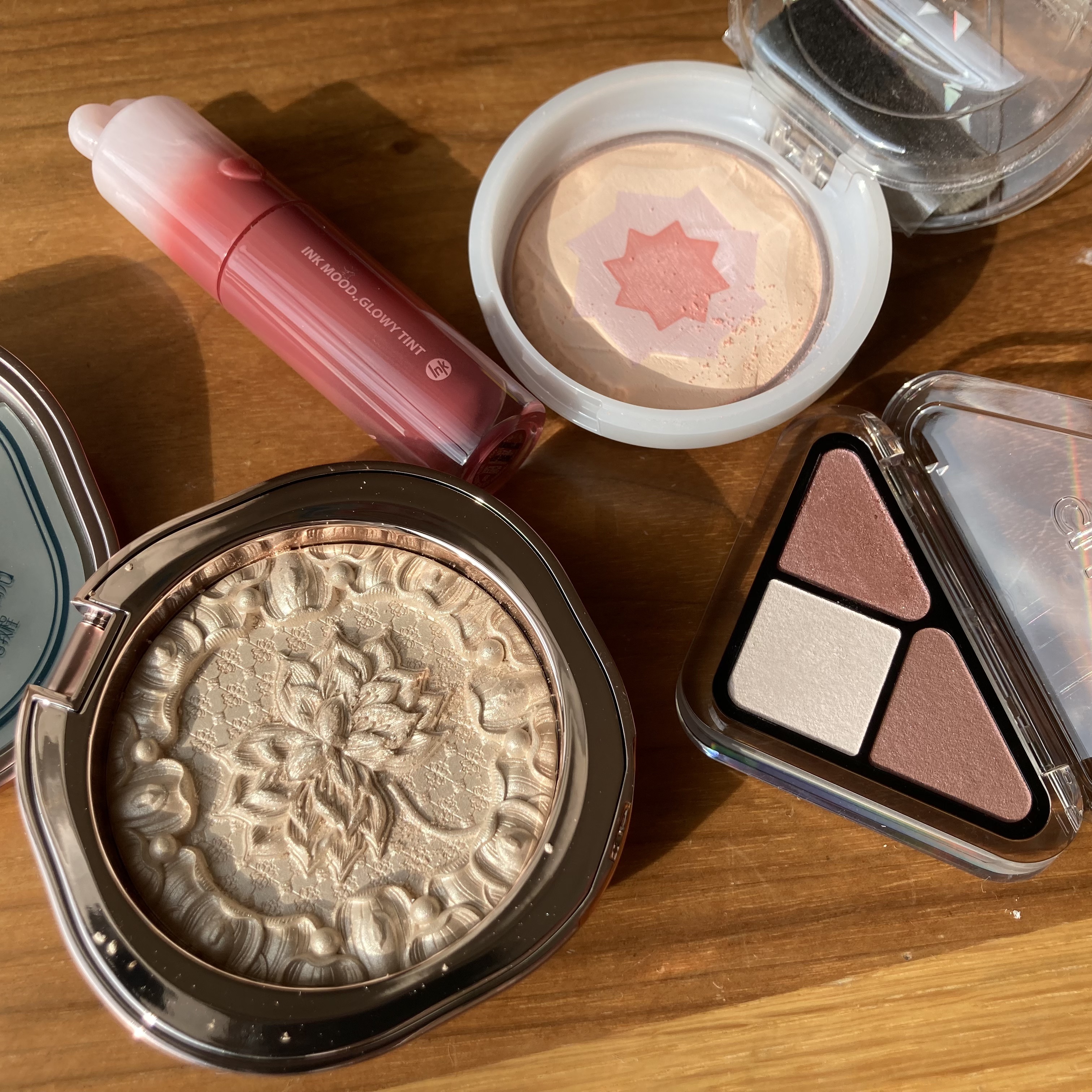 気になっていたのは前から出ていたハイライトだったんだけど、新商品の双蓮彫刻ハイライトを実物で見て一目惚れ✨ 店員さん曰く、今までのものよりも粉が細かく、光り方が繊細なんだとか。 たしかにラメが細かくて、自然に光ります✨ シルバーラメがメインで、ベージュぽい色味だから、イエベメイクにもブルベメイクにも使えてます! 誕生日祝いにお母さんに買ってもらって、嬉しくて、使わない日もお守りみたいに持ち歩いたりしてます笑 でもどれもデザインがすごく凝ってて、見ているだけでテンション上がる! 強めの白っぽい、けどナチュラルなハイライトがほしい方、元気が出るお守りみたいなコスメがほしい方におすすめ!