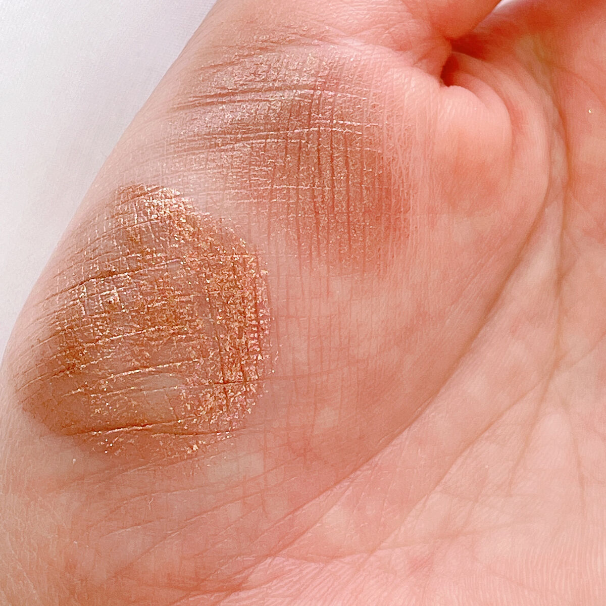 第一印象は"凄いメタリック感" 上記は直接瞼に塗った場合ですが、この存在感を柔らかくしたい時は、指先に少量取ってから瞼にポンポンとのせると調節出来ました。 軽くこすってもよれず、ラメ飛びもありませんでした。 それなのにオフは簡単で、お肌への負担もかからず◎