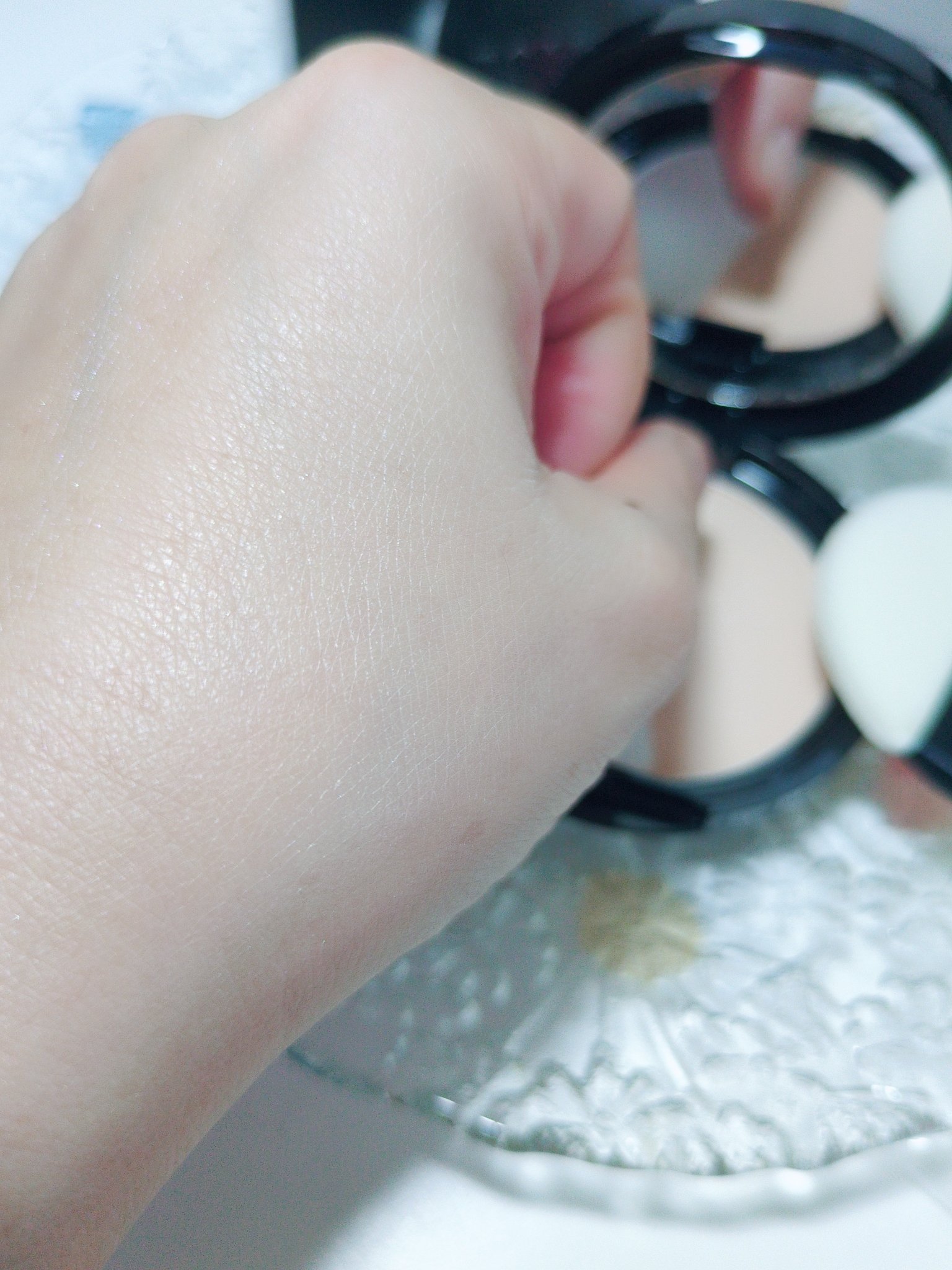 色つきなしとほんのりカバー半月色01。 まぜて使うと自然な仕上がりです。 アイホールにファンデが落ち込んだり、Tゾーンテカリ。 頬やチーク部分はマスクにつきやすかったり…。 チークや眉毛書くのに色がのりすぎなのも、真っ白の方で押さえると失敗しずらいですよね。 アイホールやTゾーンは明るく仕込んだり、顔全体は混ぜて使ったり、チーク部分はシミ悩みが多い部分だからカバー力重視で付けてみたり、1つでふり幅がきくのがいいですね。 家には真ん丸お月様を持って行って、外出先や旅行などする時は半月という使い方もいいかもしれませんよ。 あつい時、パウダー感があって仕込んでいると心強くて◎