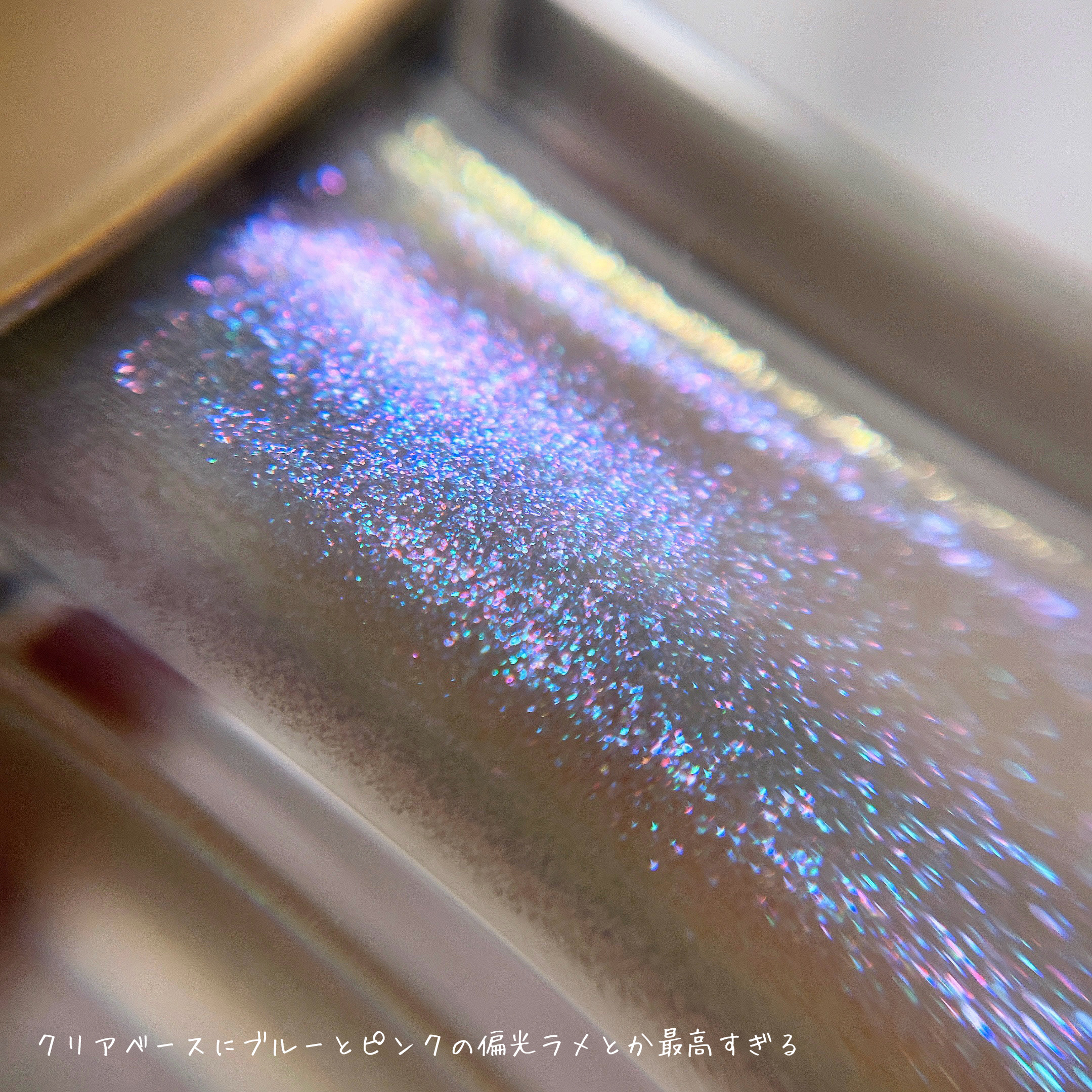 完全にラメにやられた_(┐「ε:)_ 青ラメがめちゃくちゃ綺麗で私の心は瞬殺だったよ🫠 このグロス(?)唇の上に乗せても可愛い。 キラキラですよキラキラ🥺✨✨✨ リップに重ねても良し。 グロス苦手だけどこれは良いよ。