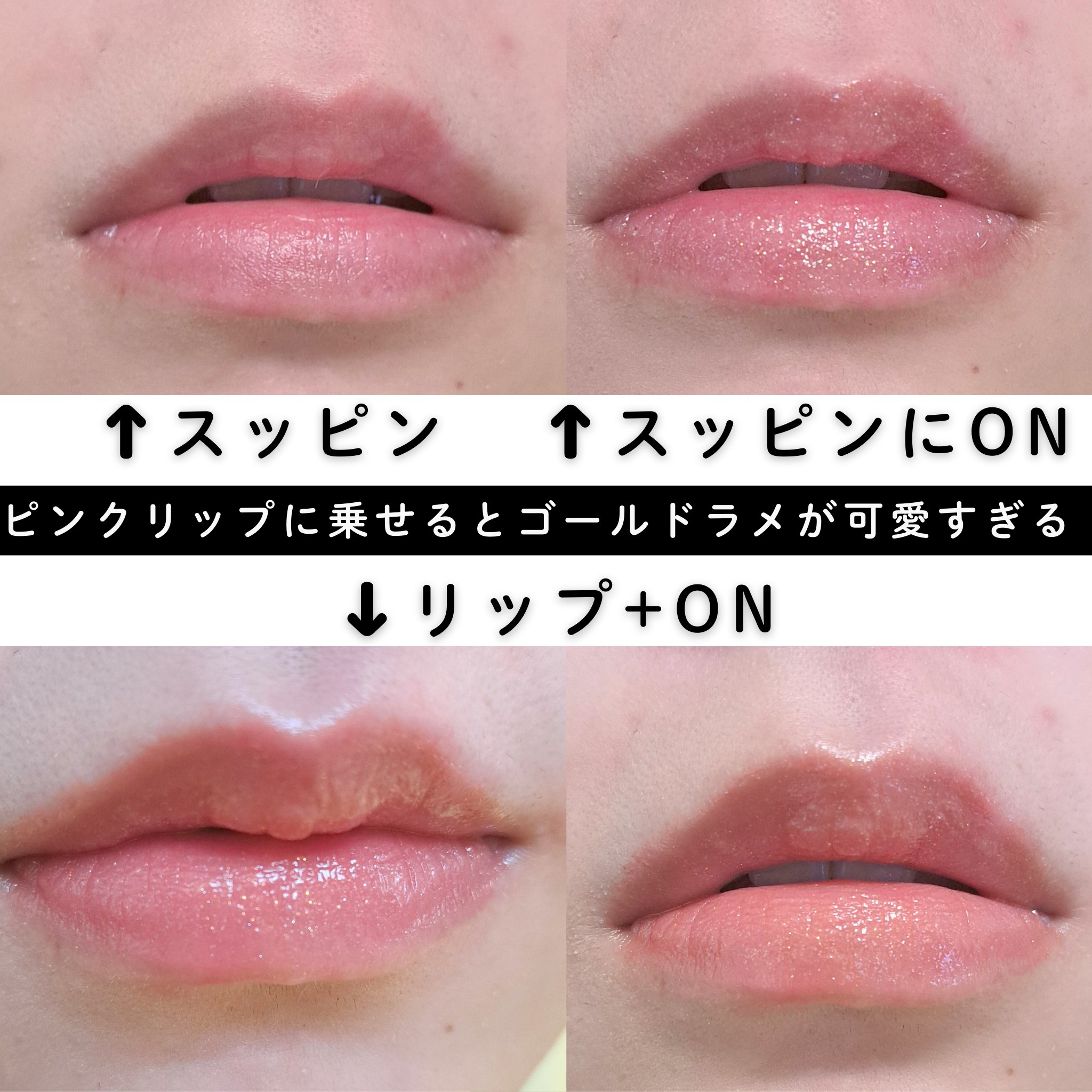 ゴールド系のラメの中に、シルバーやピンクのラメがチラチラ…✨️ ちょっと似合わなかったかな?ってリップも、重ねるとイエベカラーになるので、ニュアンスチェンジでも使えそうです☺️ けど、塗布したあとにオイルでにじむことがないし、ここまでラメが入っているにも関わらずザラザラしないので本当に使いやすい👏