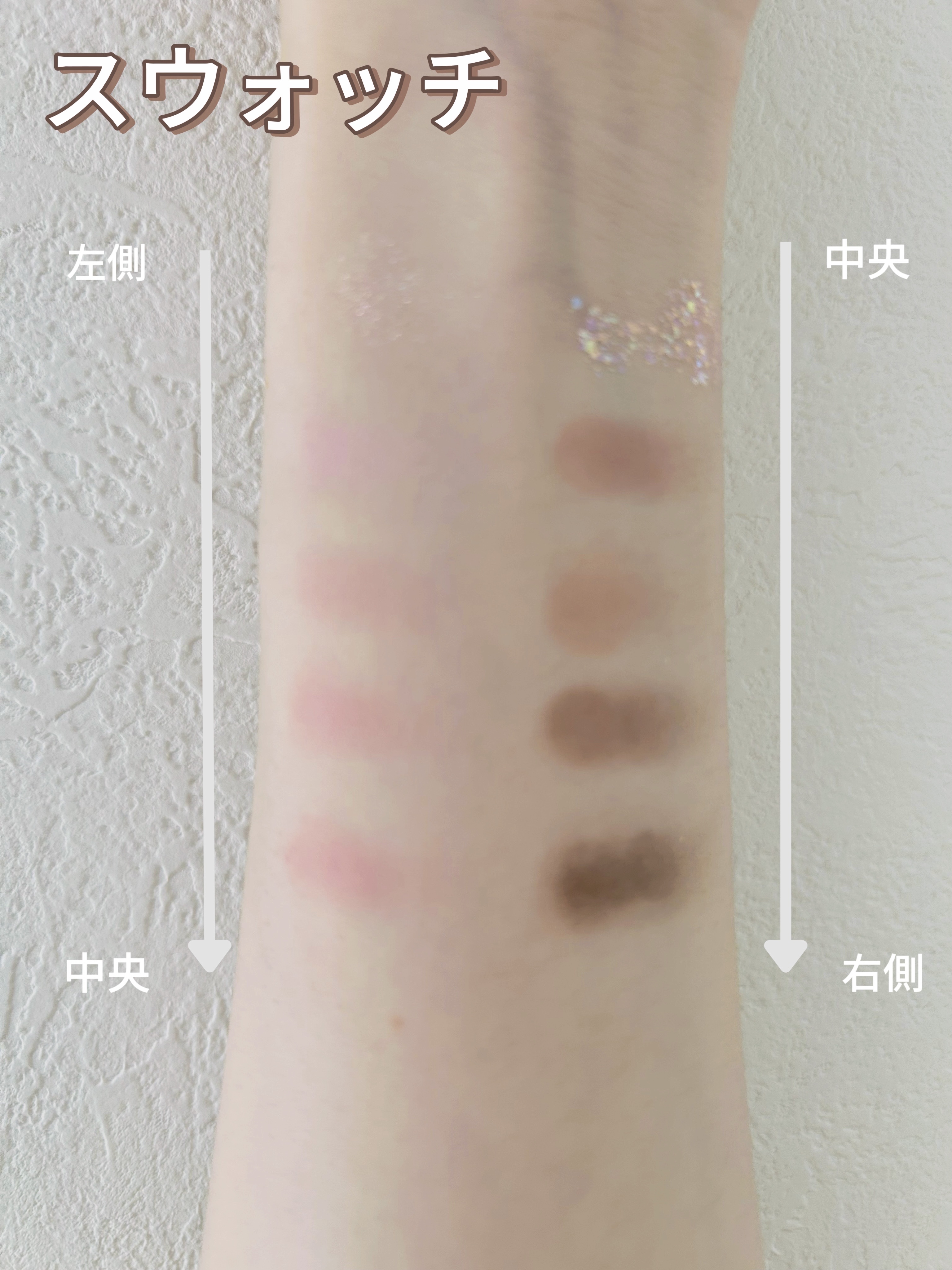 パーソナルカラー × トレンドカラーの掛け合わせ!肌トーンに合わせて自分の似合うトレンドカラーが楽しめるそう♡ サラッとしたマットアイシャドウに細かいラメ、むにゅっとした華やかな大粒グリッター。 マットシャドウはブラシ塗りで少しずつ重ねて陰影をつけるのが好きです。 どんな組み合わせをしても失敗しづらいのが◎!その日の気分で割と何も考えずホイホイのせていくかも🤔 ピンク多めかブラウン寄りかで印象が変わるので、飽きずに楽しめるのが多色パレットのいいところ♡ ブルベですが、ここまでくすみのないピンクのマットシャドウは手持ちになかったので新鮮🐟 可愛くて見た目でもときめきますね🩰ブルベさん、ピンク好きさんおすすめです♡´-