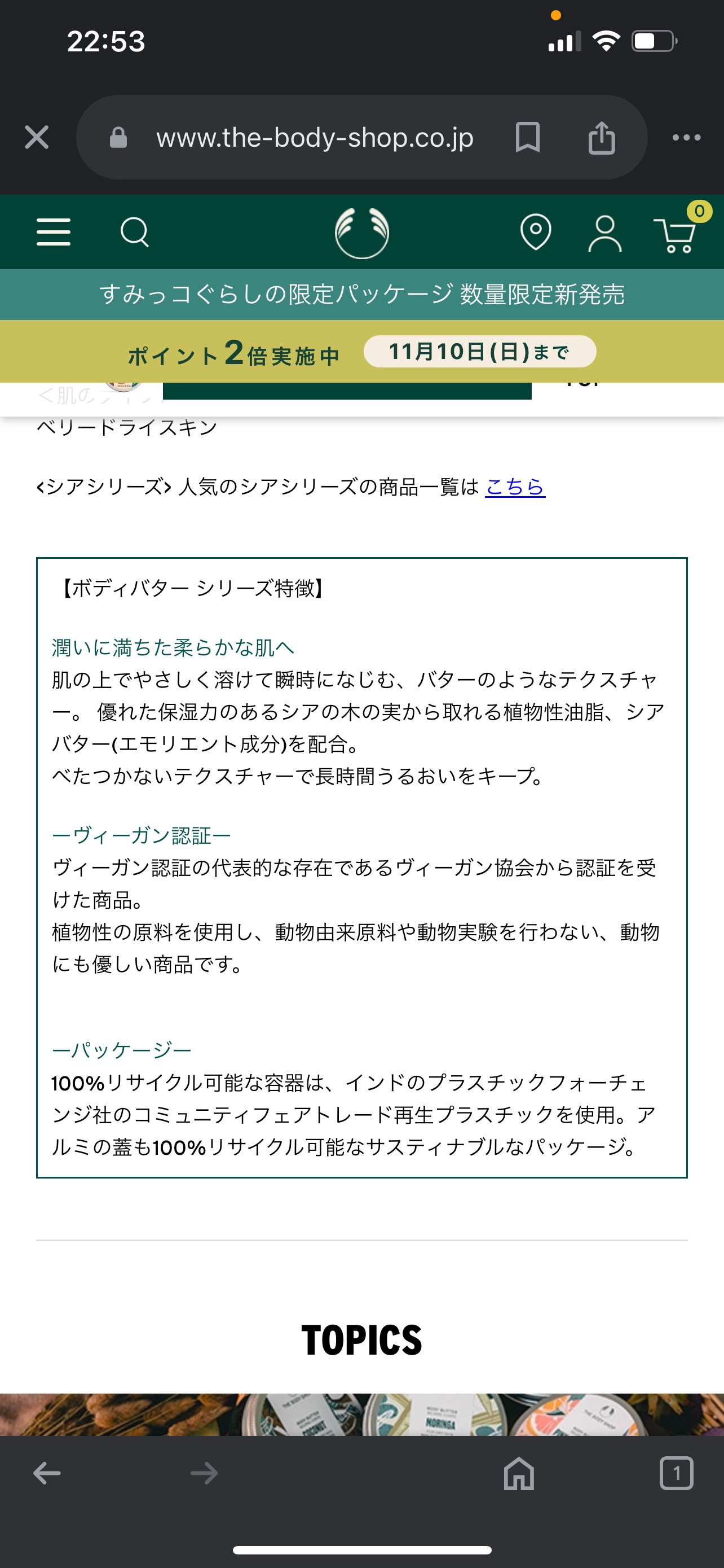 結構硬めのテクスチャーで保湿力もかなり高いですが、夏にも使えそうなくらいベタつかないので使いやすいです◎ 香りも甘すぎずほんのり甘い程度なので匂いが残りすぎず使いやすいと思います。 THE BODY SHOPのシアはあまり癖がなくて気に入っています。