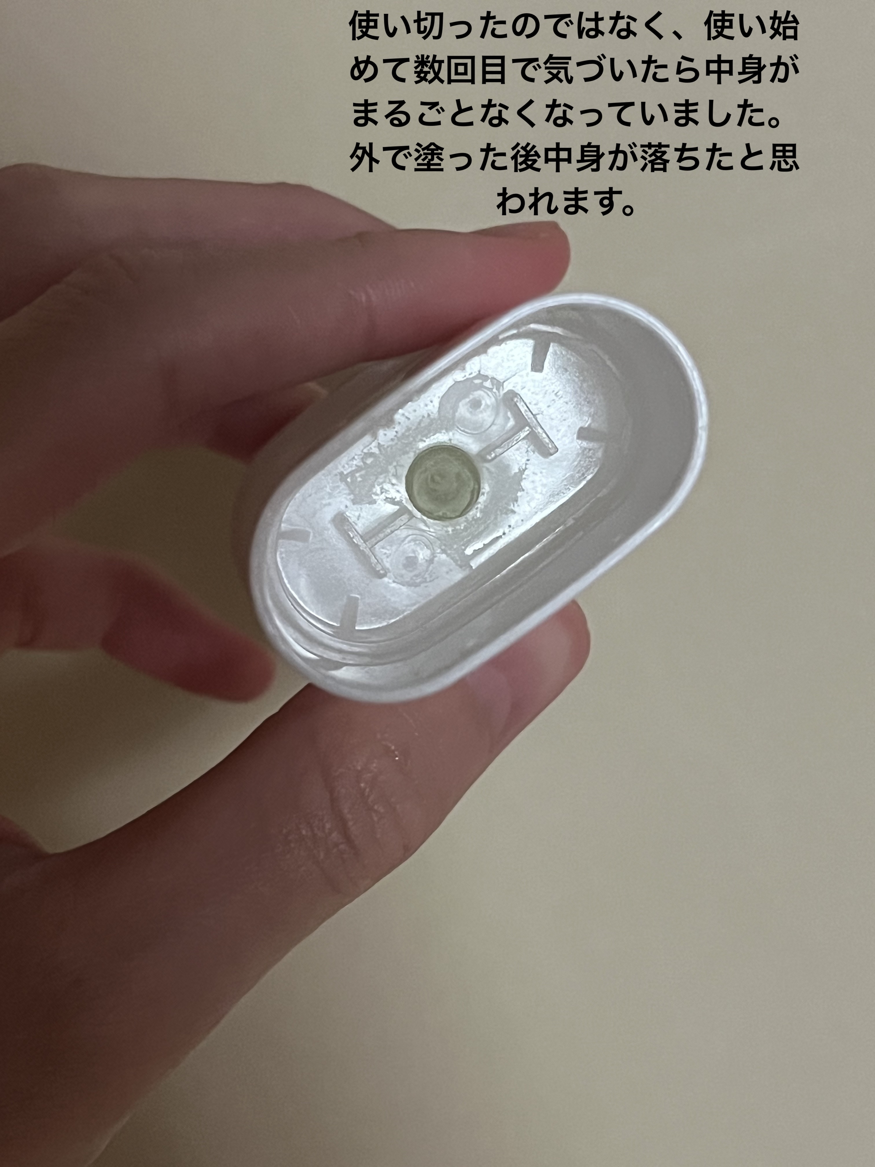 A’pieu アピュージューシーパンUVスティック GR01 マスカットバー韓国の日焼け止めです。韓国製品は今まで買ったことがなく、抵抗があったのですが、買った当時はスティックタイプの日焼け止めってまだまだ種類豊富でなかったのと、幅をとらないコンパクトさとパケの可愛さが気になり購入しました。買ってから結構経ってしまっていますが最近使い始めました。外出先でのみ使っています。パケが可愛くてポーチの中で幅を取らないところと、外出先で塗る時手を汚さずに塗れるため、手を洗わなくて済むところがポイントです。マスカットの香りはうっすらとします。塗った感じも悪くはなかったのですが、この日焼け止めには驚かされました。使い始めて数回目、さあ今日も塗ろうと思って繰り出そうとしても出ない?!何回も見返しました。中身がない、、?理解するのに数秒かかりました。おそらく前に使った後、すごく気がつきにくいように落ちたと思われます。柔らかいから落ちても音しないかも。思えば使い始めたばかりの時、少しだけ繰り出している時に、なんとなく落ちそうな気がしました。ぐらついてたりしてたわけではないんですがみっちりはまってる感じがしなかったもので。少ししか使っていないのに落ちるなんてつめの甘いつくりですね😠繰り出しすぎてもいないです。少しずつしか出していません。もう評価のつけようもないレベルなので星1です。初めに買った韓国製品がこの調子だと今後韓国製を買う気がしなくなりました😞でも今度モニターで頂いた韓国の洗い流すパックを投稿します。そちらはこの日焼け止めを使う前から使っています。近いうち投稿します。投稿を最後まで読んでくださりありがとうございました!😊#アピュー#日焼け止めスティック#日焼け止め