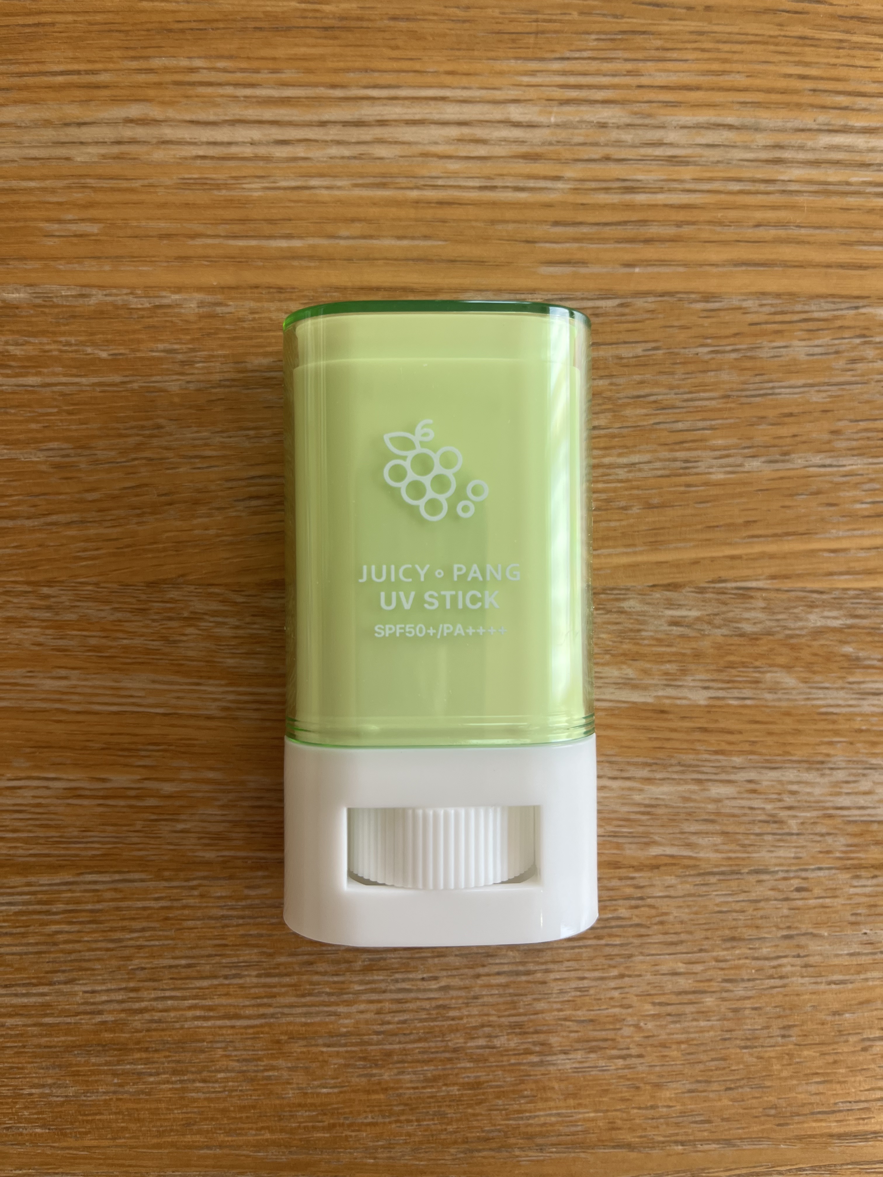 A’pieuアピュージューシーパンUVスティックGR01マスカットバースティックタイプの日焼け止めです。手を汚さず塗ることができ、固形なので液漏れの心配もなく持ち運び用に便利です。色はつかないので適当に塗っても塗りムラは目立ちません。塗り直し用にも適しています。マスカットの香りがほんのりしますが持続力はないので香水など他の香りものと併用しても問題無さそうです。#夏のお供紹介します