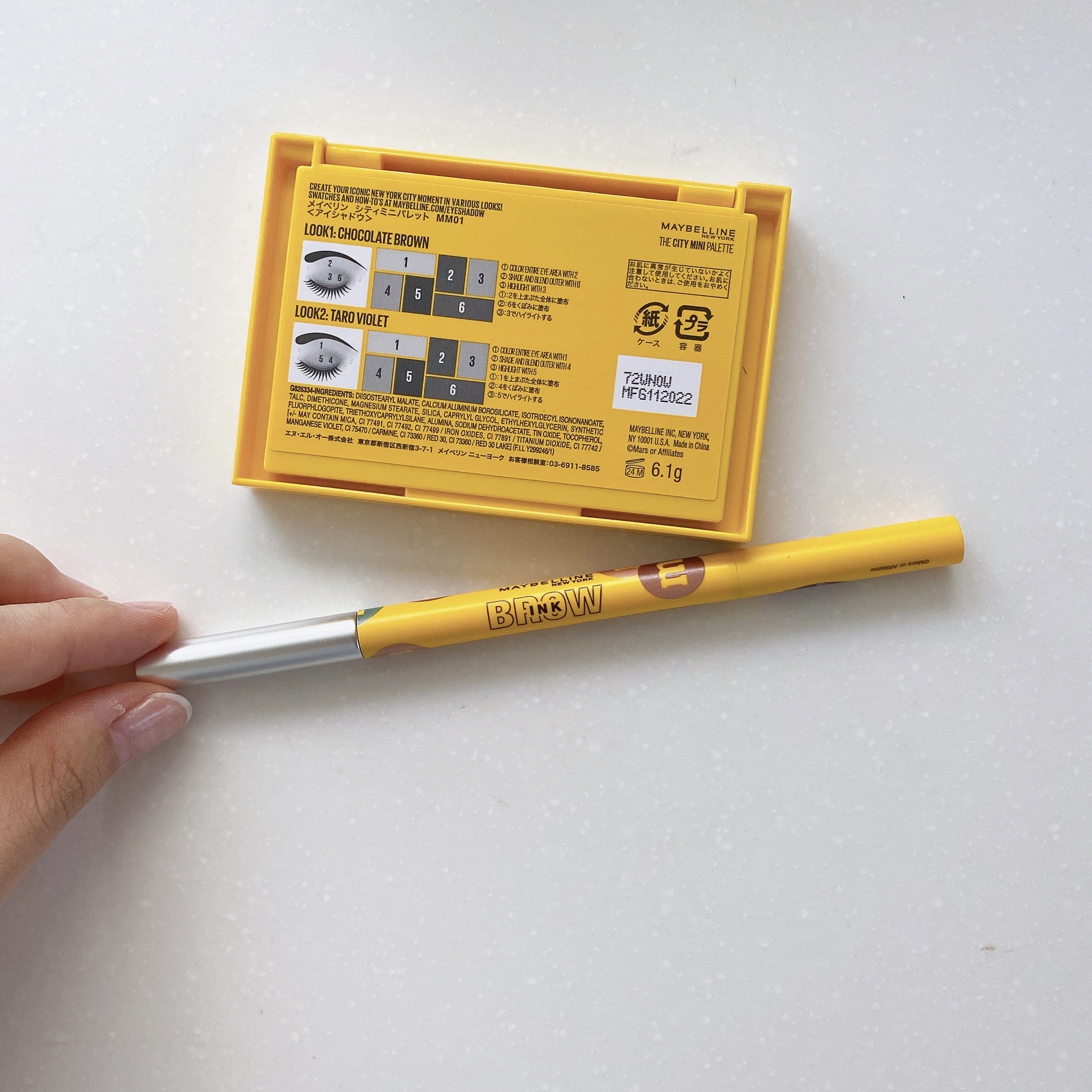 シティミニパレットは♡のカラーが発色よくて粉質も◎でした!(指塗り) SPステイ マットインクは結構派手なカラーでした😳 パープルはぼかさないと結構すごい色になる笑😂 かなりパキッとした色…!! このリップはしっかり保湿してから塗るのがおすすめです。 ブロウインク カラーティントデュオはお気に入りのアイブロウ!細くて描きやすいし色も◎ ブラシは細くてちっちゃいよ〜!!