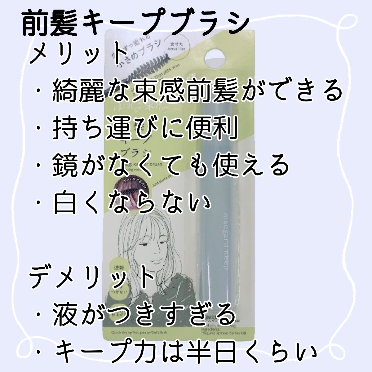 | ヘアスタイリングランキング第99位 | マスカラみたいな広めのブラシで サッと髪に撫でるだけで 気になるあほ毛をおさえることができます。 | 詳細を見る | |