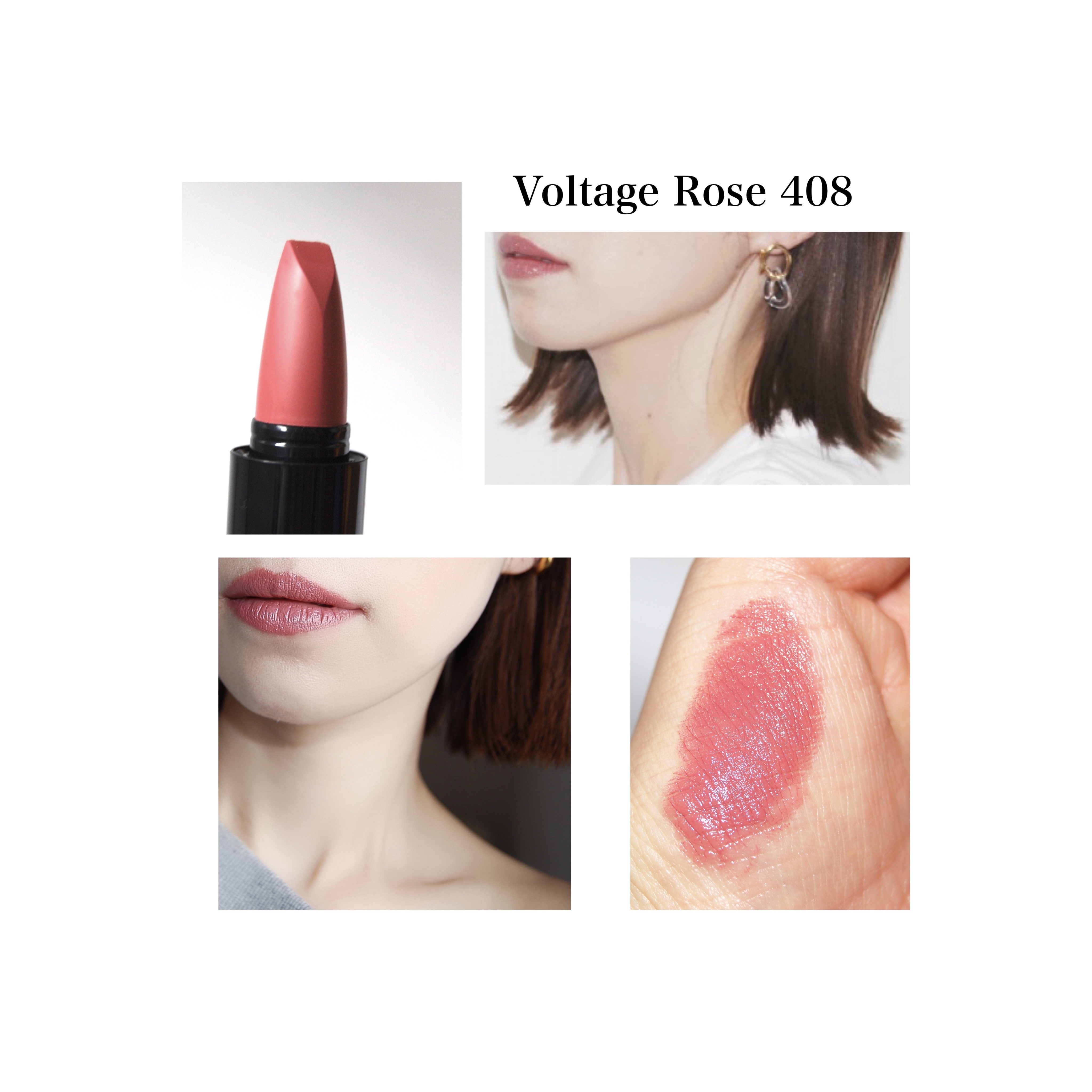 体温でトロけるように唇に付いてくれて、むっちり、もっちりした質感だと思います(*´-`) カラーは、408VOLTAGE ROSEも416RED SHIFTも私の唇ではピンクよりに発色しました。 VOLTAGE ROSEが日常使いしやすいピンクベージュカラー。 RED SHIFTは、ワインレッド的な強いカラー。 落ちにくさは、口紅の中ではかなり色残りすると思います。 保湿感があるから、マスクには付くし、摩擦すると取れますけど、色残りはします。 飲み物くらいでは色は剥げなくて、食事すると流石に落ちました。 付け心地がよいので、これからも大切に使いたいと思います。