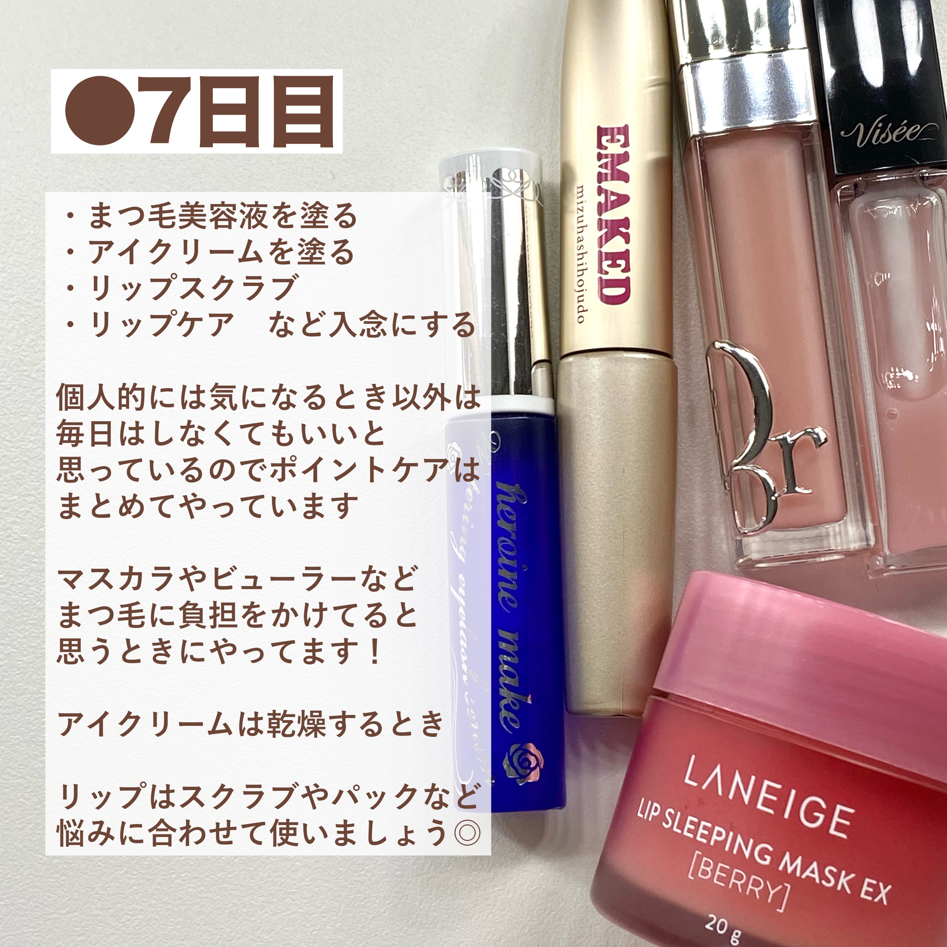 【夏休み】1週間で垢抜けに近づく方法🩶/【プロフィール】→【フォルダ】→【垢抜け方法】でさらに詳しく過去の投稿をまとめてあります!眉毛の整え方など気になる方はぜひご覧下さい🔍────────────✅1日目 爪を整える伸ばしてもいいけど伸ばしっぱなしは❌長くても整えるだけで清潔感UPするしすぐにできるので今すぐやってみましょう!ついでに爪の保護や保湿もしてみると◎夏はサンダルを履くので足も忘れずに🌟────────────✅2日目 眉毛を整える個人的に1番印象が変わる部分だと思うし眉毛も少し整えるだけで全然変わるから眉山をなくしてみるとか長さを整えてみるとか似合う眉毛やなりたい眉毛によって違うけどちょっとでも整えてみると良さそう👍────────────✅3日目 ムダ毛処理をする私は眉毛を整えるついでに顔剃りもするので顔はやってないですが全身ムダ毛処理をする!部分的には剃るとは思うけど剃り残しとかも含め月1くらいで全身まとめてしちゃいます🌟全身の保湿は面倒であまりできてないですがカミソリ使用後は保湿必須なので月1くらいは時間かけて全身保湿するようにしてます🙆🏻♀️────────────✅4日目 ストレッチ&マッサージこれは1回じゃなく継続した方がいいけどマッサージで凝り固まった筋肉をほぐしたり軽くストレッチするだけで血行が良くなるしダイエットや美肌になりたい人にも◎(継続しないと意味ないけどまずはやってみる)頭皮・肩周り・股関節・ふくらはぎ・足裏を中心にストレッチやマッサージをしていますが時間があれば他の部分もやってみて下さい👍────────────✅5日目 スペシャルヘアケア普段とやってることとあまり変わらないけどいつもより丁寧にしっかりヘアケアをする!①ブラッシングをしてホコリなどの汚れを落とす②シャワーでしっかり髪を濡らしてシャンプーする★洗い流すトリートメントでスペシャルケア④いつも通りリンスorコンディショナー⑤髪をタオルに挟んでやさしくタオルドライ⑥ヘアミルクがあれば塗る→ドライヤー⑦頭皮が乾いてきたらヘアオイルを塗る⑧乾かしたら頭皮ブラシでマッサージする(※シャワー前・シャンプー中でもOK)────────────✅6日目 姿勢矯正場合によっては小顔効果や痩せ見え効果も◎YouTubeなどで「姿勢矯正」と検索すればストレッチやヨガなど動画で見れます!部分的に猫背やX/O脚が気になるという人は「〇〇矯正」「姿勢矯正〇〇」などと入れると👍これも継続が必要ですがやり方が分かるとやりたくなるし、結構変化が目に見えるので個人的にはダイエットよりやりがいを感じる(笑)────────────✅7日目 部分ケアをするまつ毛美容液を塗る・アイクリームを塗るリップスクラブやリップケアなど入念にする個人的には気になるとき以外は毎日しなくてもいいと思ってるのでポイントケアはまとめてやっちゃいます👀メイクするとまつ毛にも負担をかけてるしたまには目元のケアもしてみましょう!リップはスクラブやパックなどもあるので悩みに合わせて使うのがオススメ🎶────────────最後までご覧いただきありがとうございました!!参考になれば嬉しいです🔍#垢抜ける方法#夏休み_垢抜け#垢抜け#ネイルケア#眉毛_整え方#ムダ毛処理#脱毛ケア#マッサージ#ヘアマスク#ヘアケア#姿勢矯正#まつ毛美容液#アイケア#リップケア#Myあか抜け記録