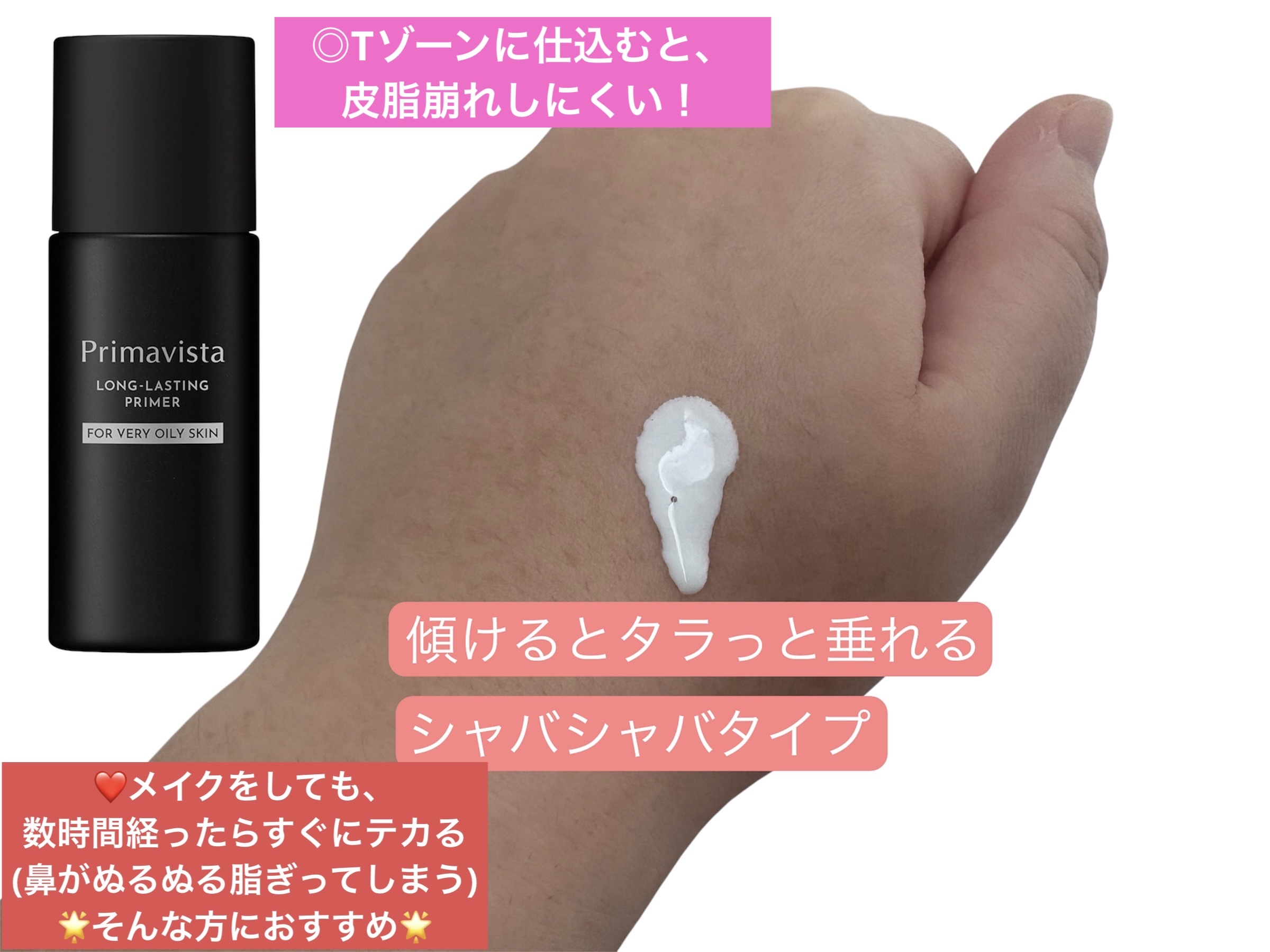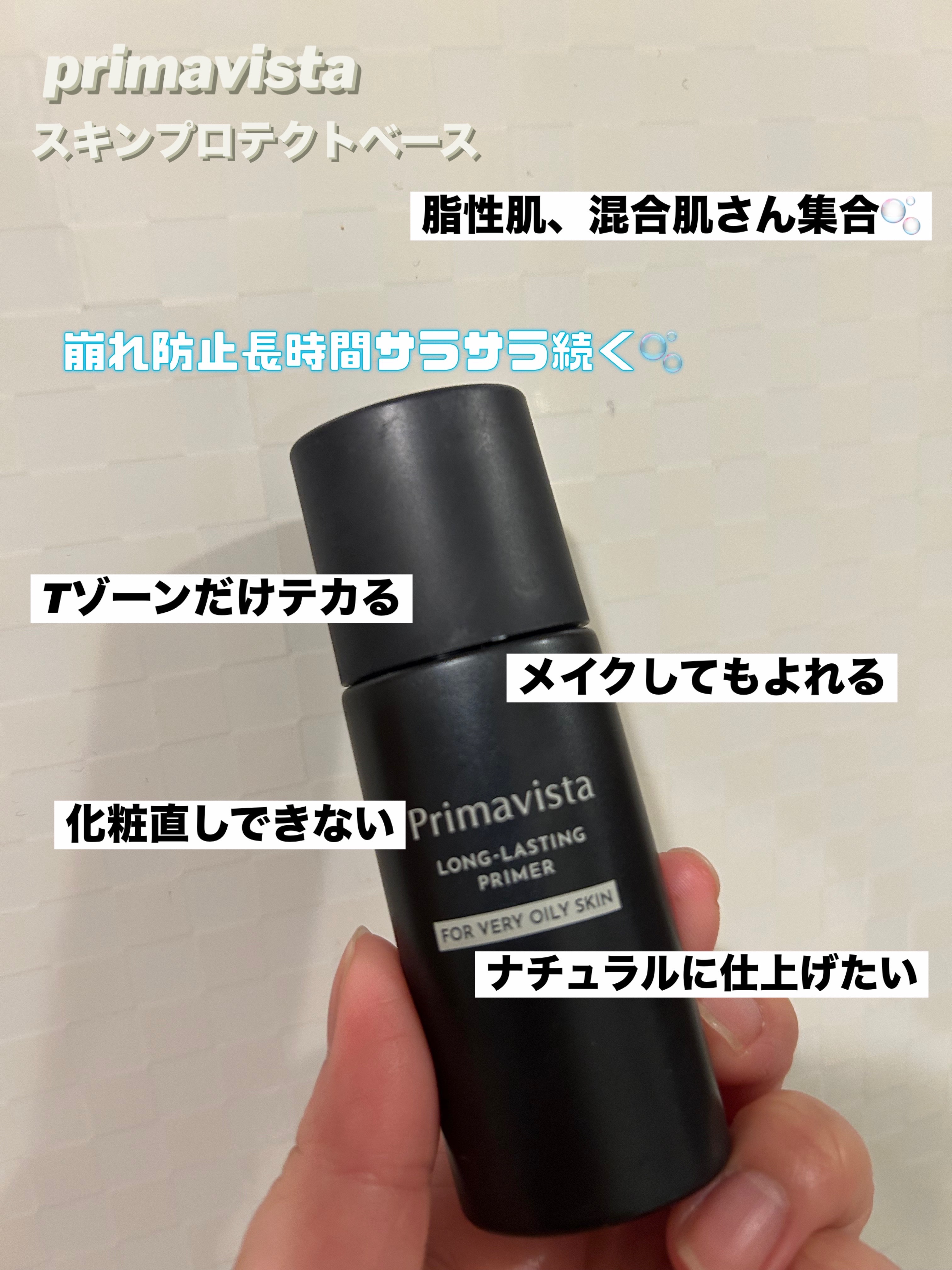 ◎Tゾーンに仕込むと、皮脂崩れしにくい!【利点】(即効性)◎Tゾーンなど皮脂が多く出てしまう箇所に仕込むと、皮脂崩れしにくい。◎乾燥しすぎることもなく使用出来た。(敏感肌対策)敏感肌でも、ヒリヒリしたり、痛くなったり、刺激に感じたりすることなく利用できた点(※主にTゾーンのみの仕様です)(仕上がり)毛穴を完全に埋める力はないが、ソフトフォーカスのようなぼかす力はあり、上からファンデーションを重ねた時に仕上がりが綺麗。また数時間後に鏡を見た時に、皮脂抑制効果を実感することもできました。とにかくテカリやすい混合肌?脂性肌におすすめ!【イマイチな点】※振ってから使用するのですが、振りすぎると液体が飛び出てくるので注意※△シャバシャバゆるいタイプなので、量の調節が少し難しいと感じました。△カバー力は特にないので、これ一本の下地にカバー力を求める方には不向き。皮脂が出やすく、すぐにテカってしまう方や、毛穴をソフトフォーカスのようにぼかしたい方には、おすすめ!【使い方のポイント】皮脂が出やすい、おでこ・鼻のTゾーン+顎など部分的に乗せるのがおすすめです!#皮脂テカリ防止下地#プリマヴィスタ