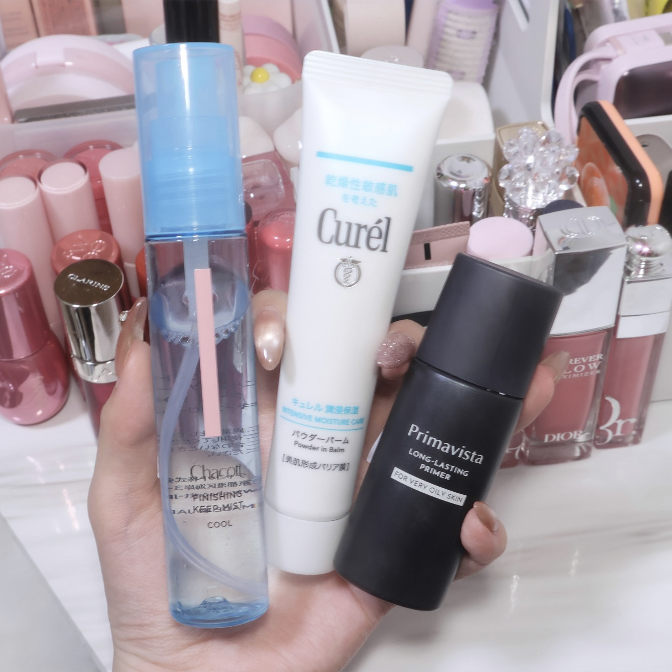 絶対に崩したくない日の頼れる三種の神器。冷蔵庫で冷やしたチャコットのミストはメイク前と後に全顔に吹きかける、キュレルのパウダーバームは本当に少量スキンケアの最後に塗る、ブラックプリマはテカる所に仕込む。これで完璧。年中皮脂テカに悩む脂性肌より。