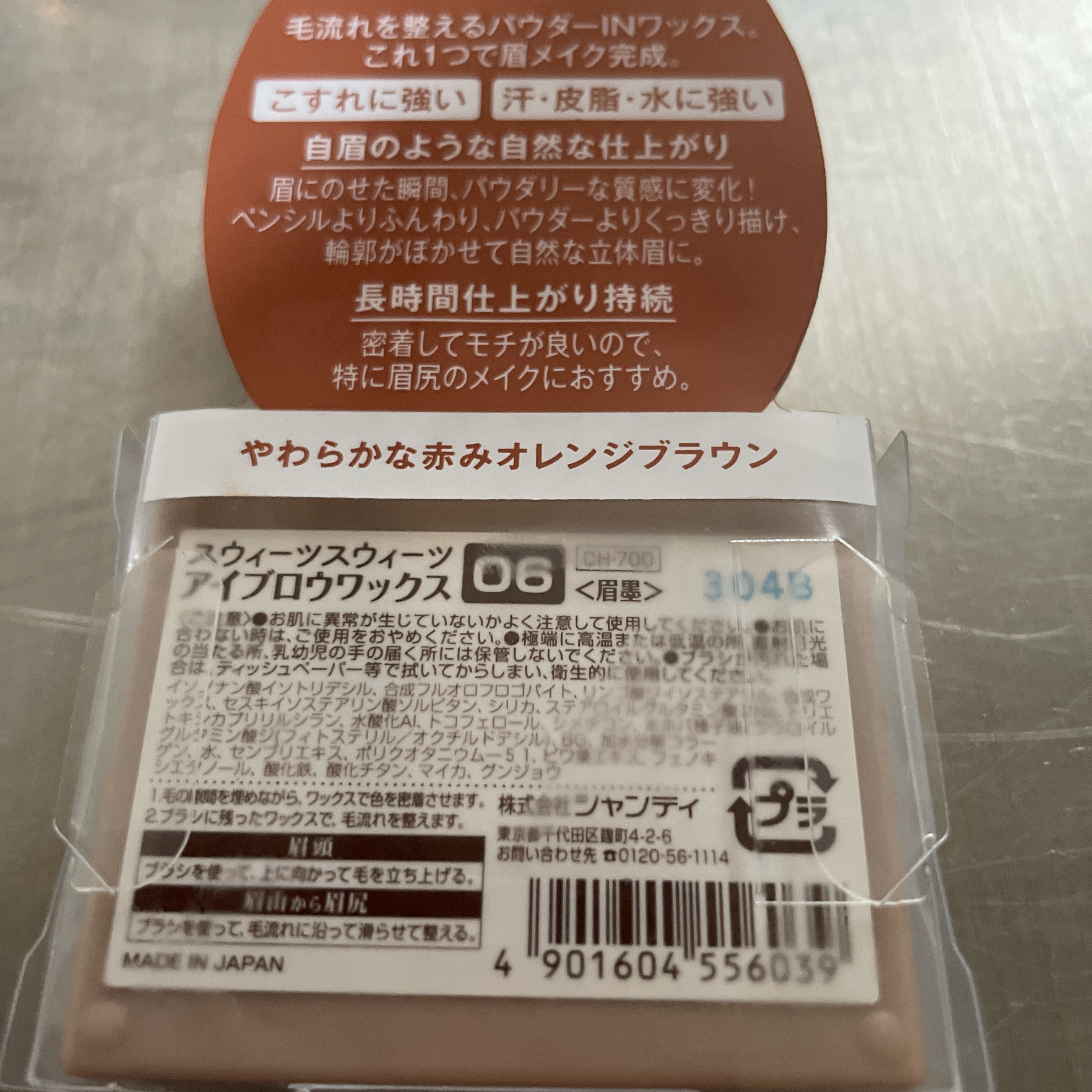 スウィーツスウィーツアイブロウワックス06オレンジブラウンかわいい色です。お気に入り。粉とびしない粉、と思って使っています。硬くてほっそーい筆で描けばペンシルとして使えるのかな???付属のブラシではなかなか難しいかも。...