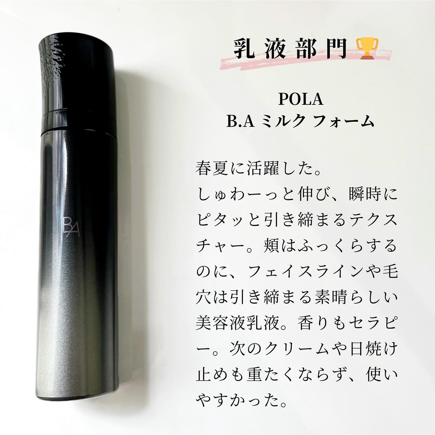 洗顔部門オバジX / フレームリフトムースウォッシュ ポイントメイクリムーバー部門ビオデルマ / サンシビオ エイチツーオーアイ 美容液部門ディオール / カプチュールトータル ルセラム 美白部門ベリーホップ / ピュアビタミンC美容液 アイケアブースター部門リバイタル / アイゾーンブースター アイケアセラム部門コスメデコルテ / リポソーム アドバンスト リペアアイセラム シワケア部門エリクシール / レチノパワーリンクルクリーム 乳液部門POLA / B.A ミルクフォーム 朝クリーム部門ランコム / レネルジーHPNクリーム 夜クリーム部門ラ・メールザ・モイスチャライジングソフトクリーム