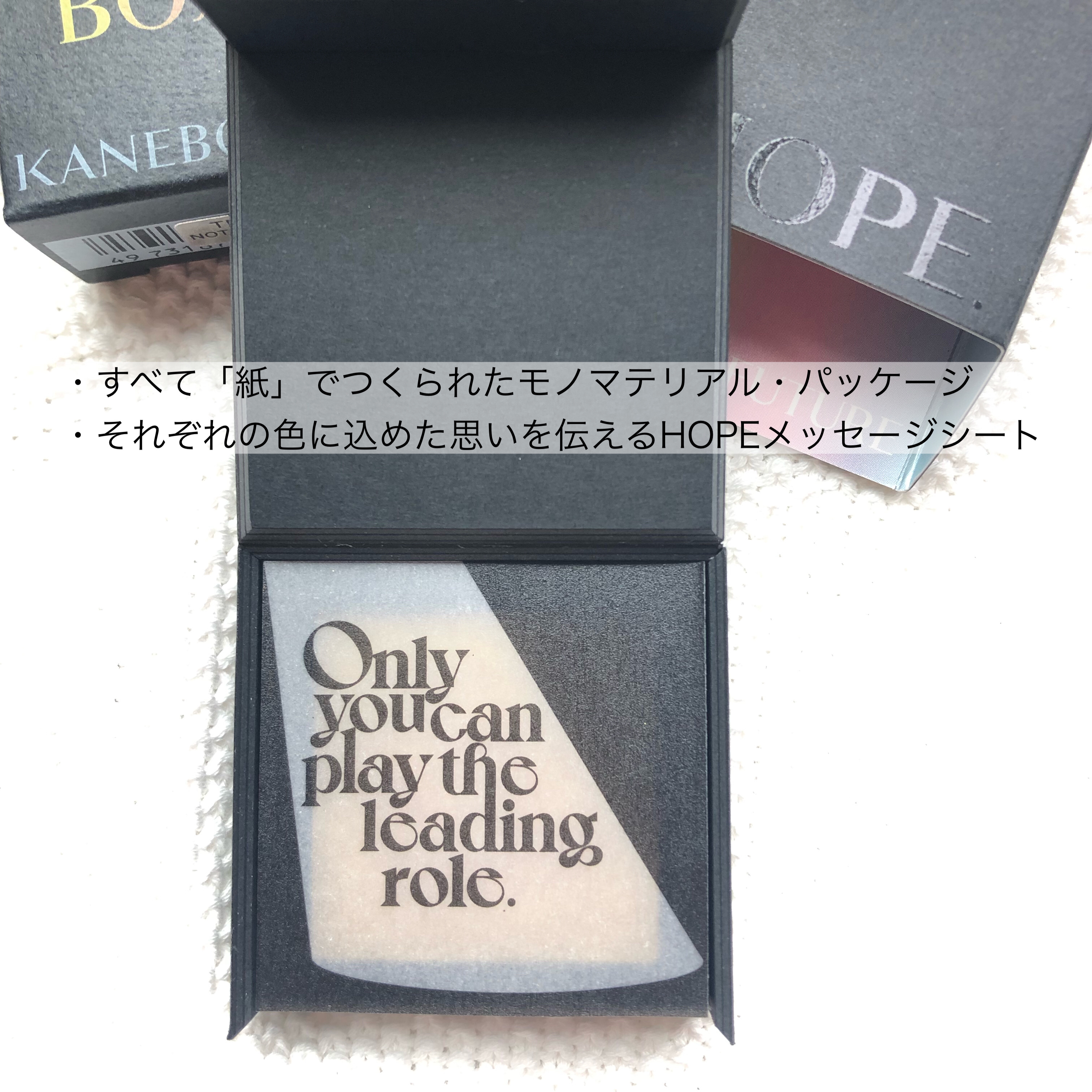 もう何と言っても輝きがキレイ! 指でひと塗りするだけでもめちゃくちゃにキレイ🥺💓 1色だけでもすごくキレイにグラデーション 出来るから時間ない時にも、 逆にすっごく気合い入れたい日にも どっちにもピッタリ😍🎉 1つ1つにメッセージが入ってて、 その頭文字を繋げると【IHOPE】になるのも めちゃくちゃ手が込んでて素敵すぎる🥺✨ そして紙で作られたパッケージもいろいろな 思いが詰まっててサステナブルなパケも 現代的で本当にすごいなぁ…と感心した。 EX2とEX3もラメがめちゃくちゃ綺麗で 毎回見る度にうっとりしてる🥺✨ KANEBOのカウンターに行った時に アイシャドウは上瞼も涙袋もEX1とEX4だけで メイクして行ったんだけどBAさんにも 褒められちゃった〜🤭🎉 (お世辞でも嬉しい💖) また購入した2色も使ったらメイクあげたい✊✨