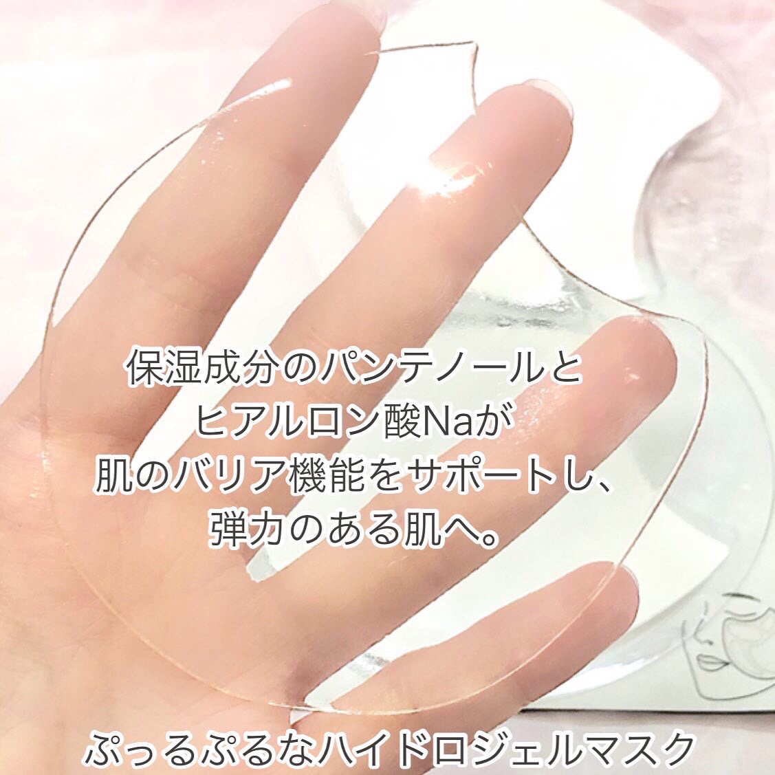 肌にピタッと密着し、潤いを与えるハイドロジェル状のフェイスマスクみたいです。 保湿成分のパンテノールとヒアルロン酸ナトリウムが、肌のバリア機能をサポートし、弾力のある肌へ導いてくれるらしい。 肌への水分補給、保湿、ハリ、肌荒れ防止。 透明なハイドロジェルのマスクです。意外としっかりしてる。 肌にもしっかりと、張り付いてるし、めくれてきにくいと、思います。目元や頬の乾燥対策に使いやすいですね。